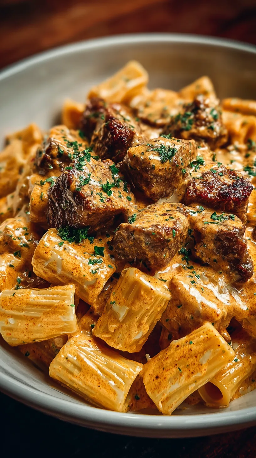 Return the seared steak tips to the skillet, add the drained rigatoni, and toss everything together. Use reserved pasta water to adjust consistency. Garnish with fresh parsley and serve immediately.