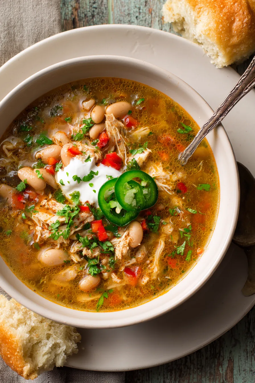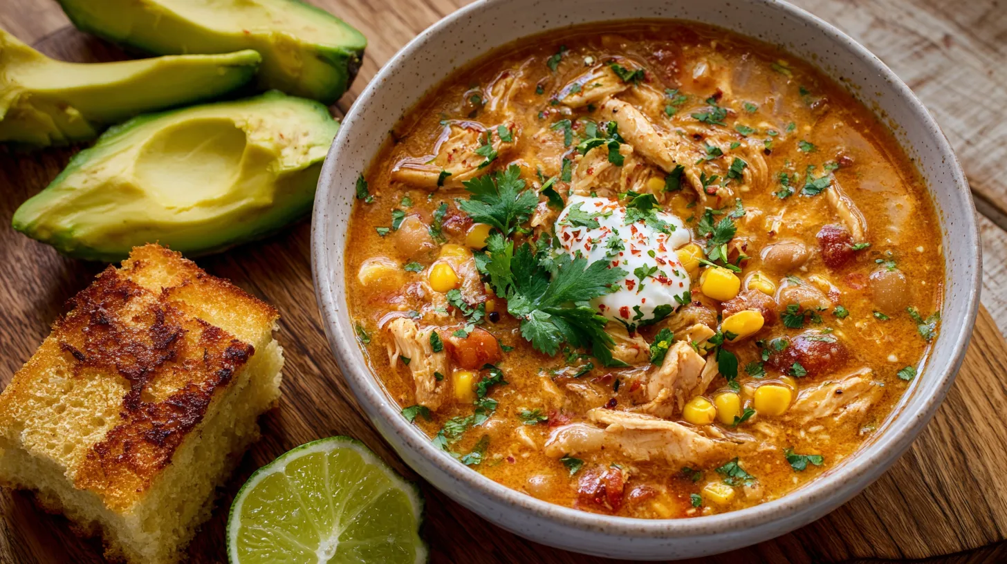 Remove chicken, shred into bite-sized pieces, then return to pot. Stir in cannellini beans and simmer uncovered for 10 minutes. Remove from heat, discard bay leaves, then slowly stir in heavy cream and lime juice. The cream creates richness while lime juice brightens the entire dish.