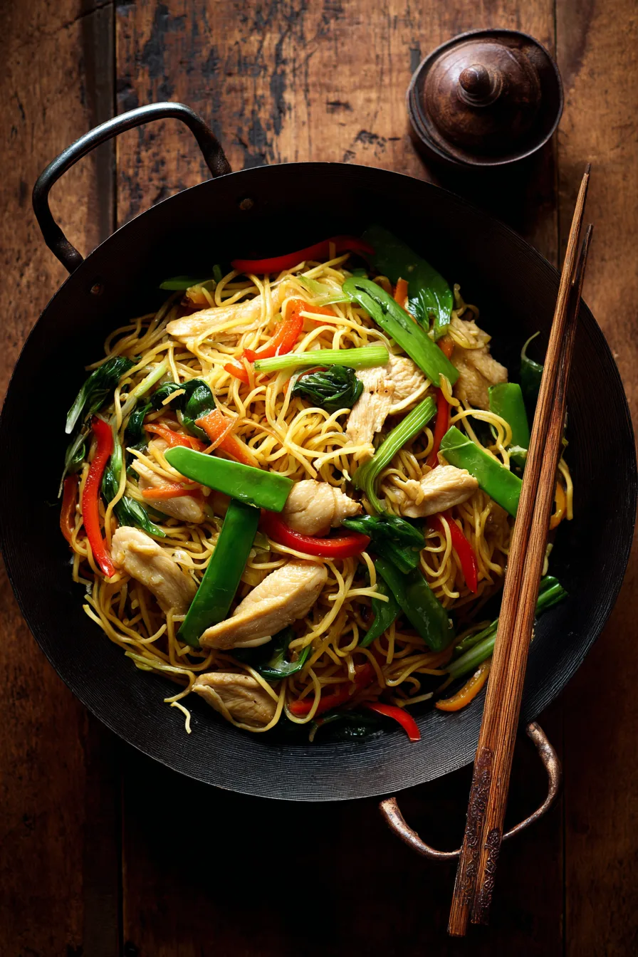 Present your chicken chow mein in warmed bowls with chopsticks and ceramic spoons for an authentic dining experience. Complement the main dish with steamed dumplings, fresh cucumber salad with rice vinegar dressing, or simple wonton soup. For entertaining, serve family-style on a large platter garnished with sesame seeds, cilantro sprigs, and lime wedges, allowing guests to customize their portions and add fresh brightness to each bite.