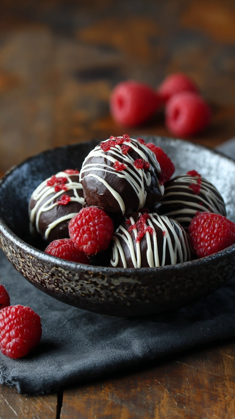 Elegant Presentation: Arrange truffles in paper petit four cups on a marble serving board, garnished with fresh raspberry leaves and edible gold dust for luxury appeal.