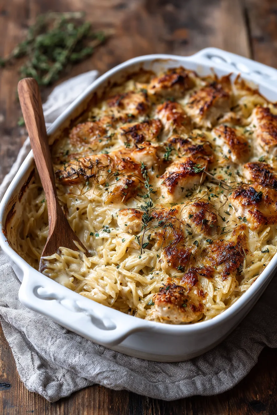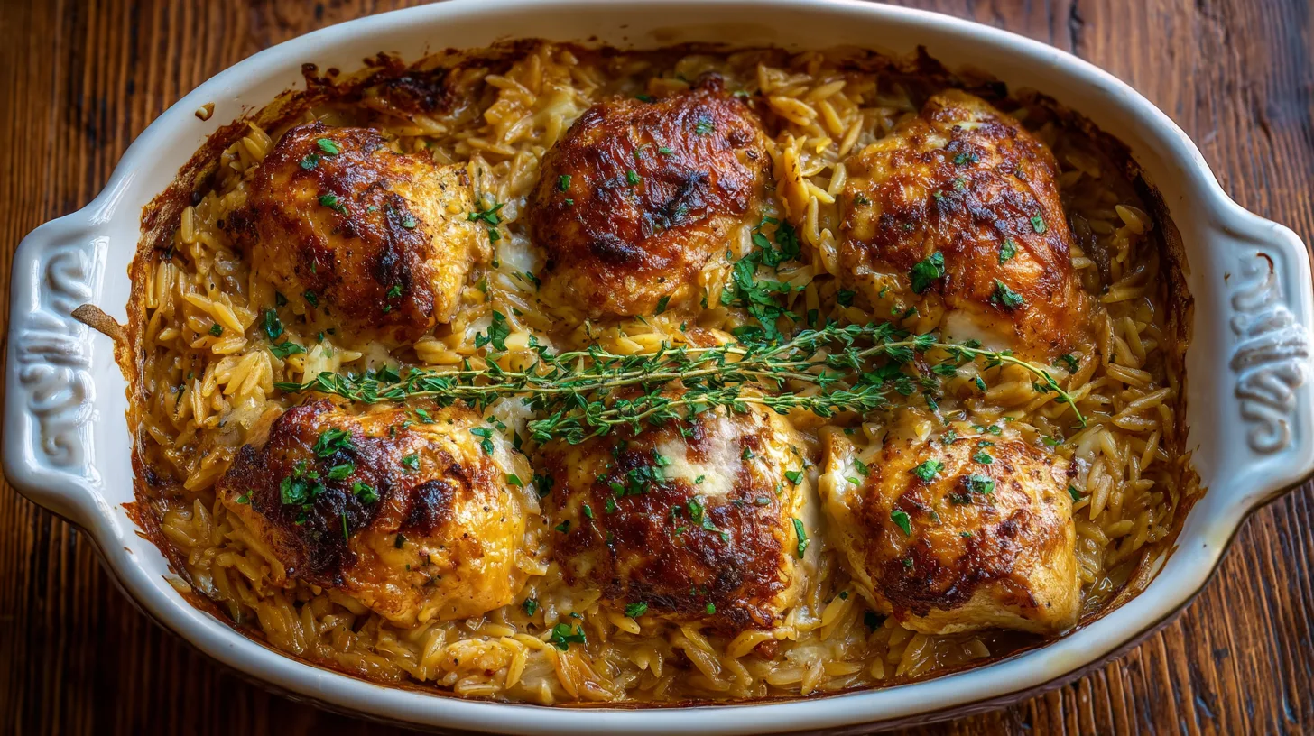 Avoid rushing the onion caramelization process – this step cannot be hurried without sacrificing flavor depth. Don’t skip covering the casserole initially; exposed orzo will become crunchy rather than creamy. Resist opening the oven door frequently, as temperature fluctuations affect cooking consistency. Another common error is using pre-shredded cheese, which contains anti-caking agents that prevent smooth melting. Finally, don’t substitute chicken breasts without adjusting cooking time, as they cook faster than thighs.