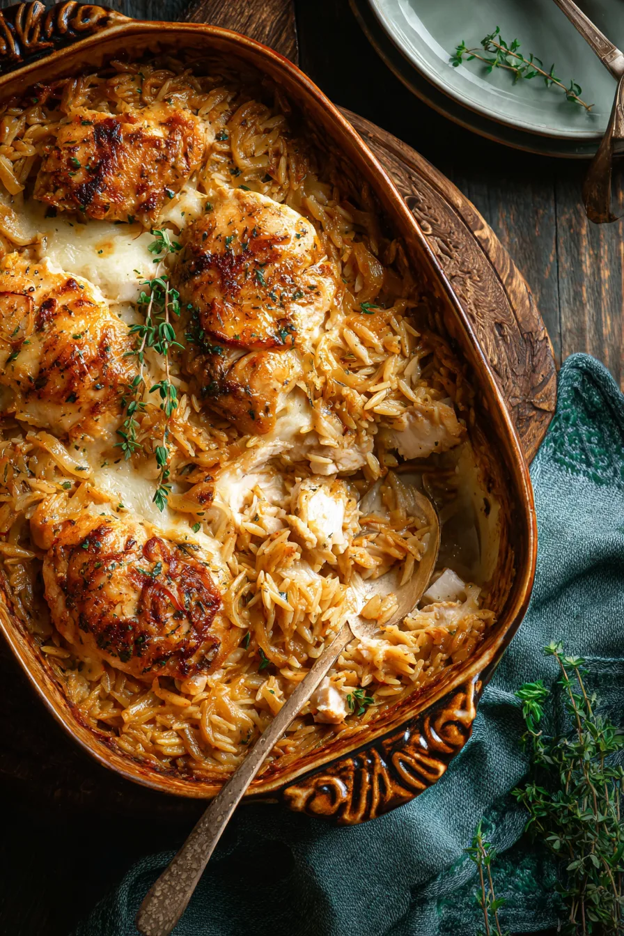 Serve this French Onion Chicken Orzo Casserole alongside a crisp arugula salad dressed with lemon vinaigrette to cut through the richness. Crusty French bread or garlic breadsticks make perfect accompaniments for soaking up any remaining sauce. For elegant presentation, garnish individual portions with fresh thyme sprigs and a light sprinkle of grated Parmesan. This casserole pairs beautifully with roasted Brussels sprouts or steamed green beans for color contrast and nutritional balance.