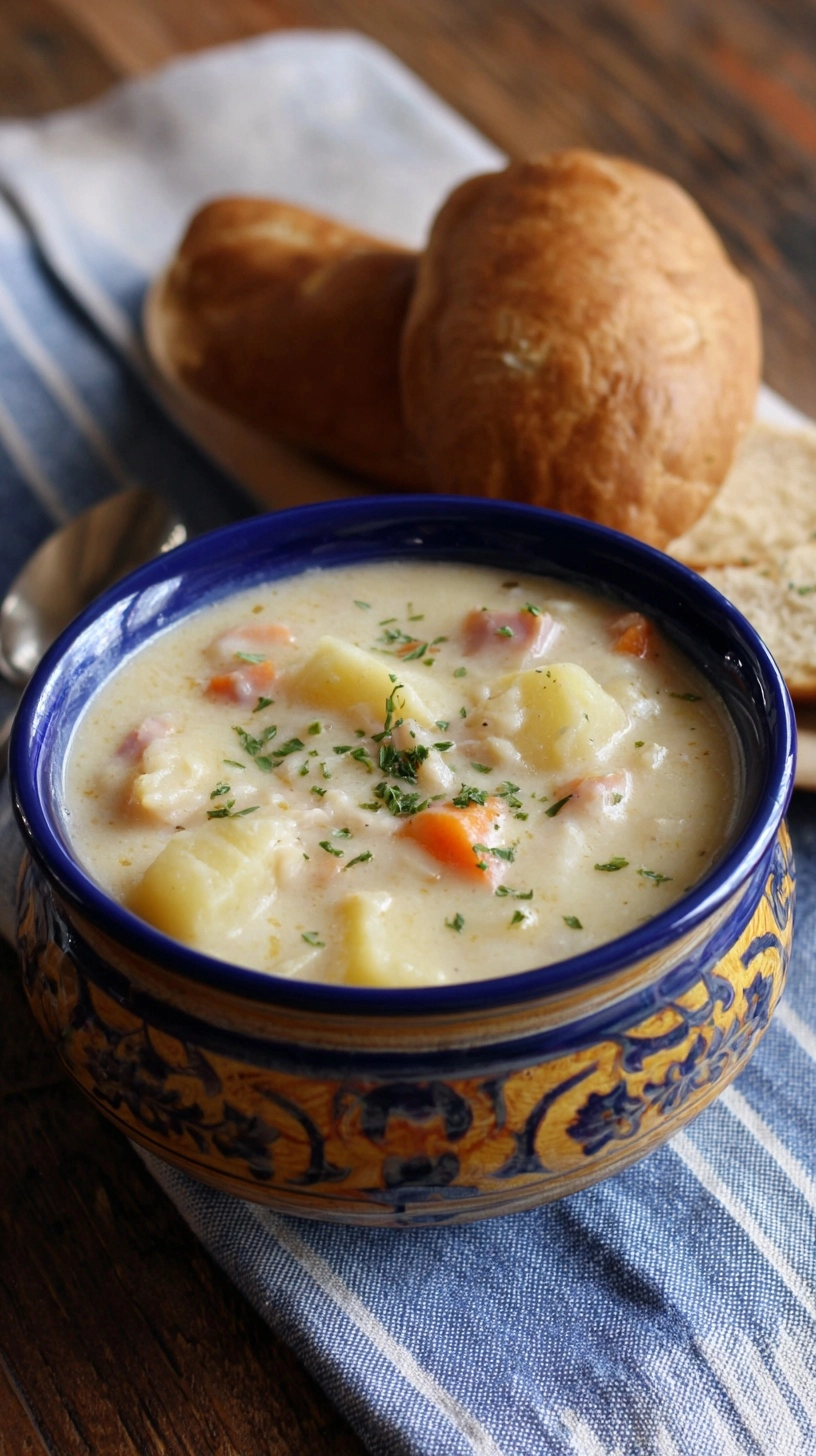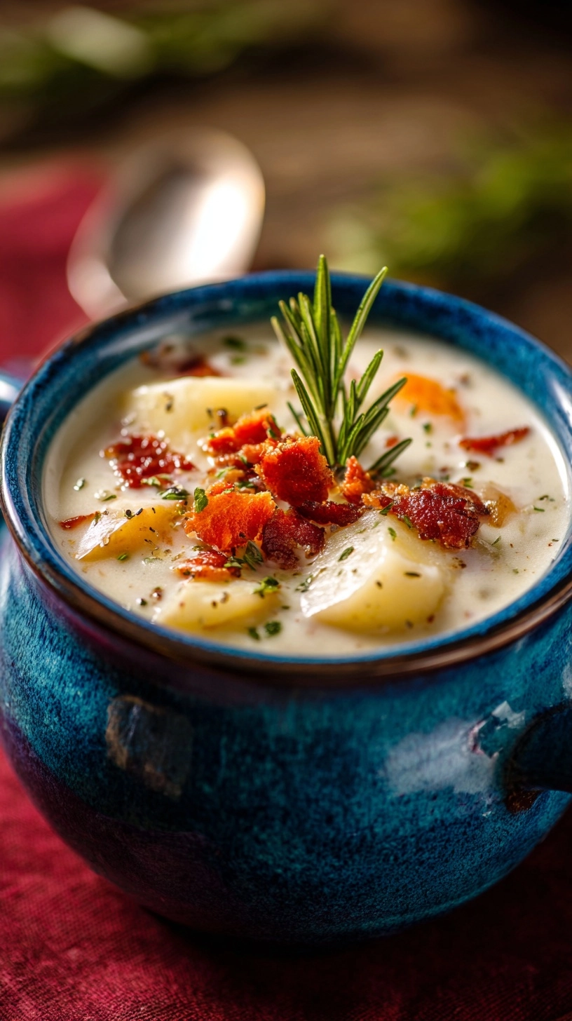 Classic Comfort: Serve in warm bowls topped with crispy bacon bits, fresh chives, and a dollop of sour cream alongside crusty sourdough bread.