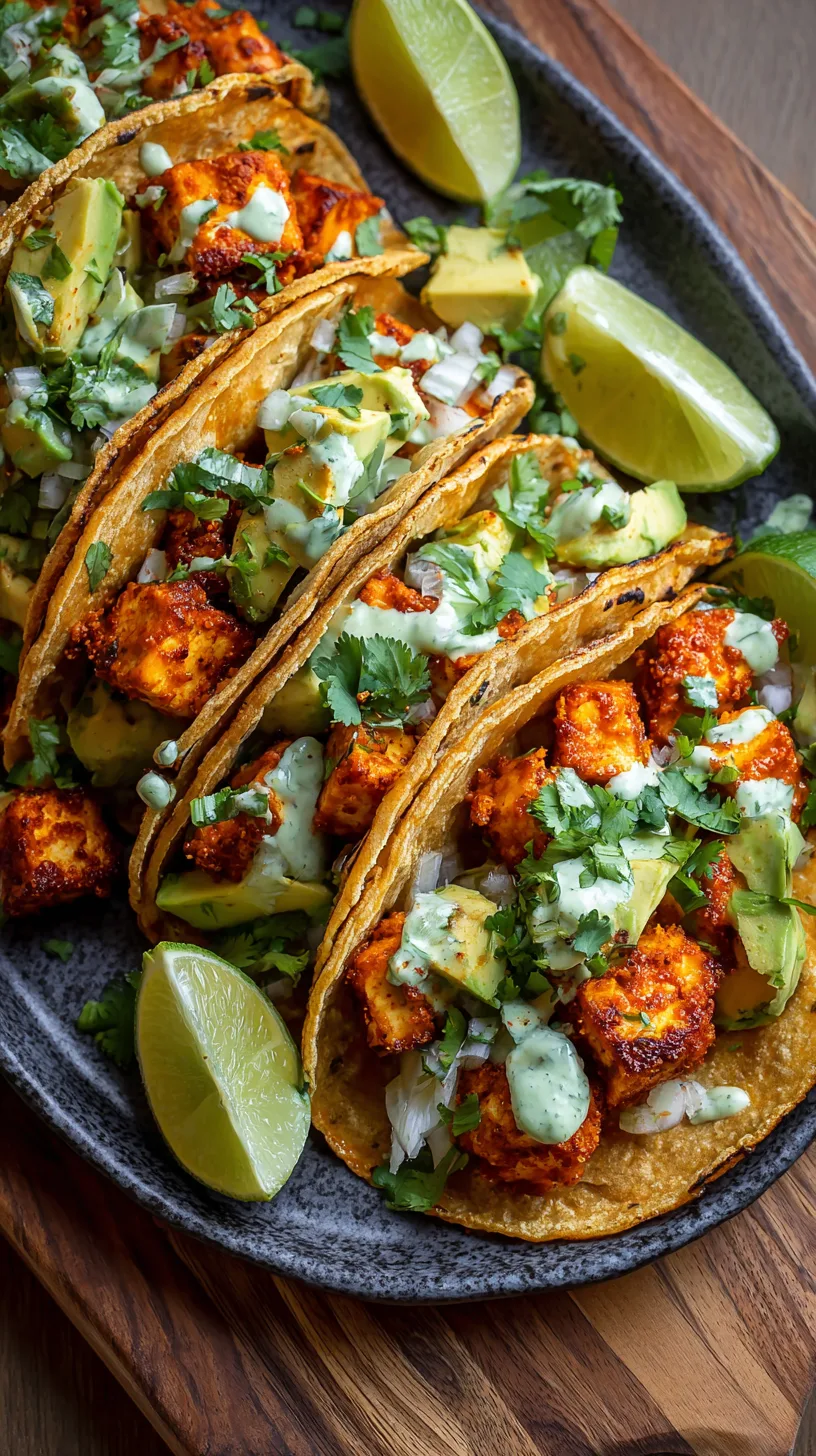 Layer each tortilla with shredded cabbage, buffalo tofu, avocado slices, and a drizzle of vegan ranch. Top with green onions and fresh cilantro. Serve immediately with lime wedges for that bright, acidic finish.