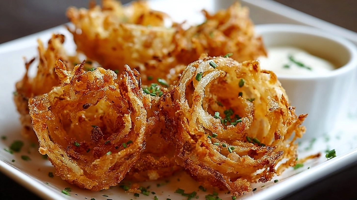Present these crispy mini blooming onions as an elegant appetizer on individual small plates with ramekins of dipping sauce. They pair beautifully with grilled meats, make excellent party finger foods, or can be served alongside fresh salads for a satisfying lunch. Consider creating a “blooming onion bar” with multiple sauce options including ranch, chipotle mayo, or honey mustard. For a gourmet touch, garnish with fresh chives or a light dusting of smoked paprika.