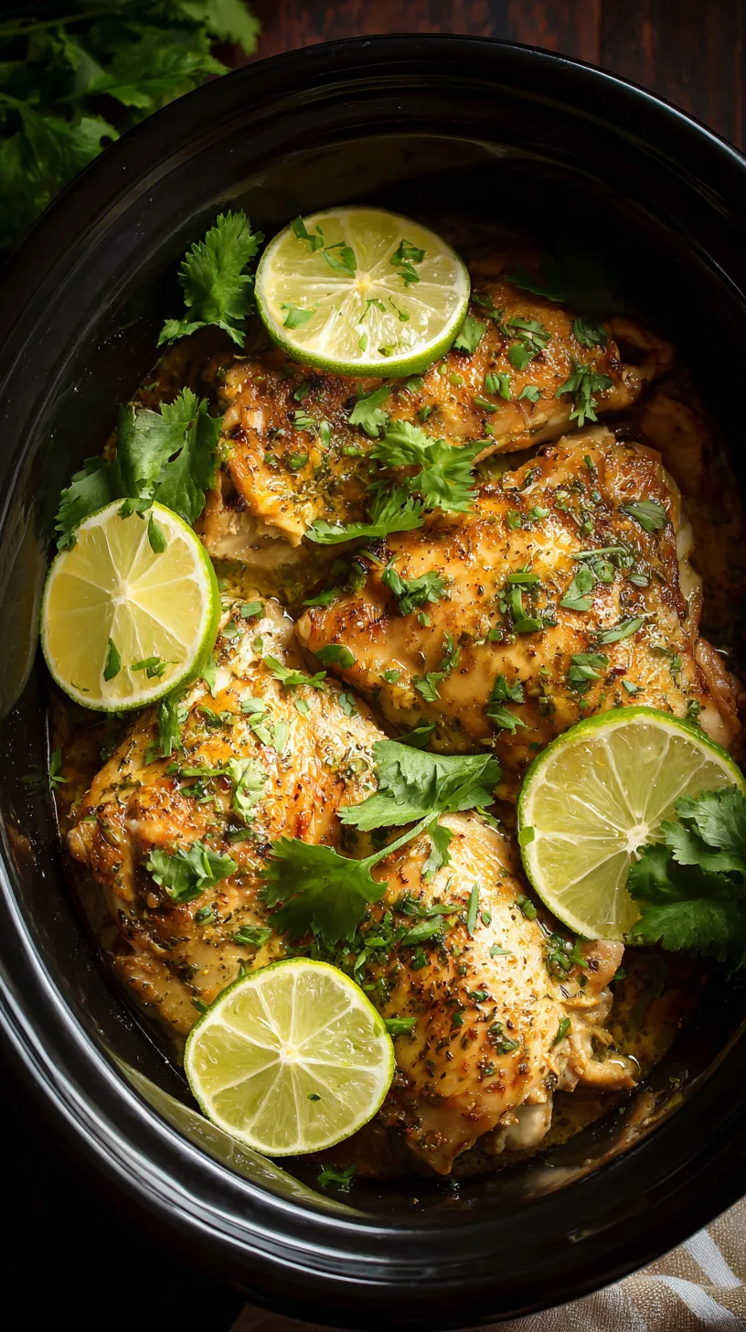 Place diced onions and jalapeños at the bottom of your slow cooker – they’ll create an aromatic bed while preventing sticking. Add seasoned chicken breasts, then pour the lime mixture and chicken broth over everything. Sprinkle half the cilantro on top.