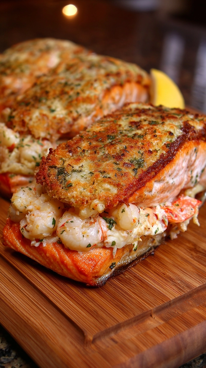Refrigerate leftover Deliciously Decadent Crab and Shrimp Stuffed Salmon for up to 3 days in airtight containers. For optimal reheating, use a 350°F oven for 8-10 minutes rather than microwave heating, which can make the seafood rubbery. The stuffing mixture can be prepared 24 hours in advance and refrigerated, actually improving in flavor as ingredients meld together.