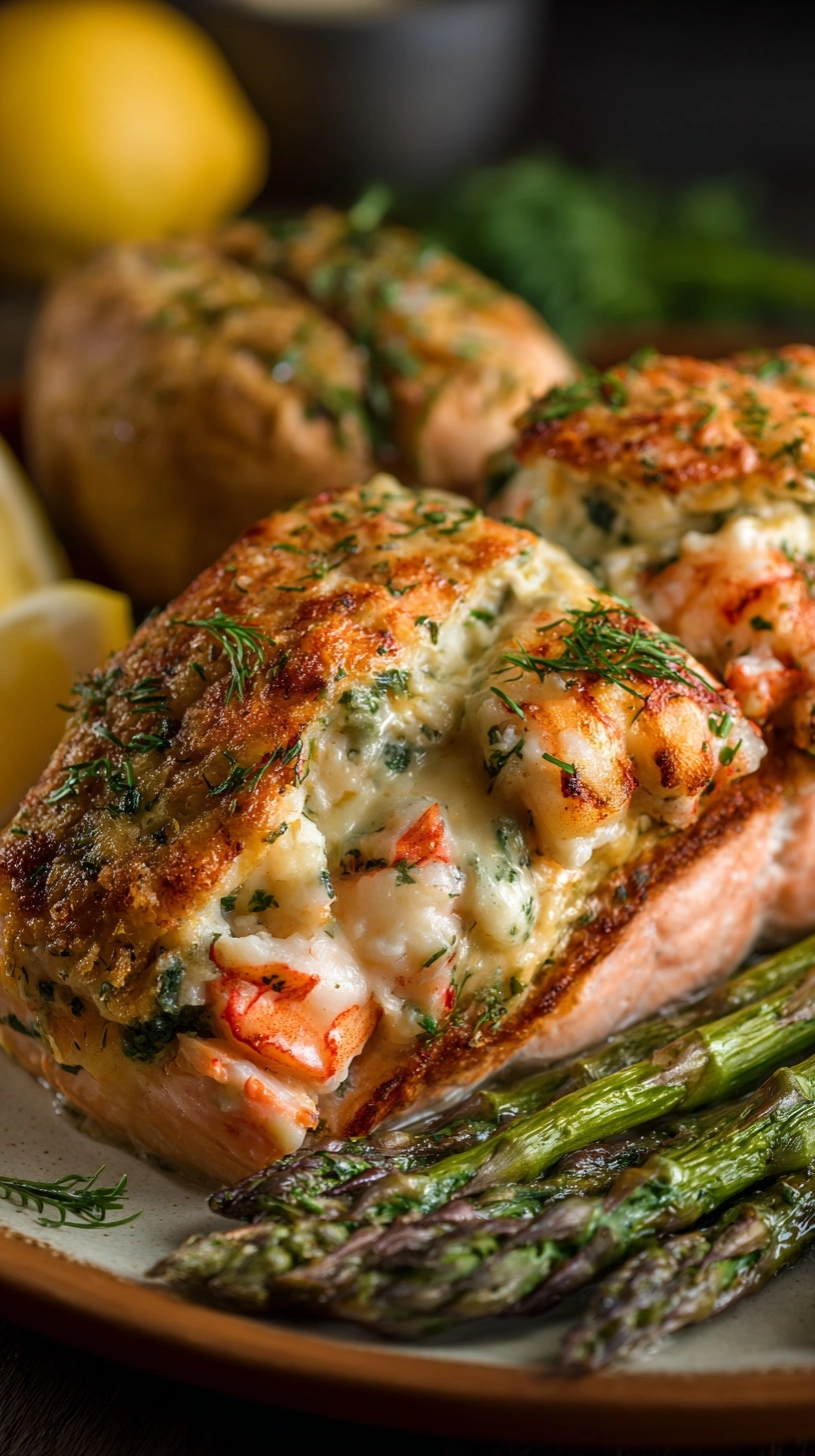 Present your Deliciously Decadent Crab and Shrimp Stuffed Salmon alongside roasted asparagus spears and garlic mashed cauliflower for a complete, restaurant-quality meal. The dish pairs excellently with wild rice pilaf or quinoa tabbouleh for added nutrition. Consider serving over a bed of wilted spinach with lemon butter sauce, creating an elegant presentation that showcases the stuffed salmon’s beautiful cross-section.