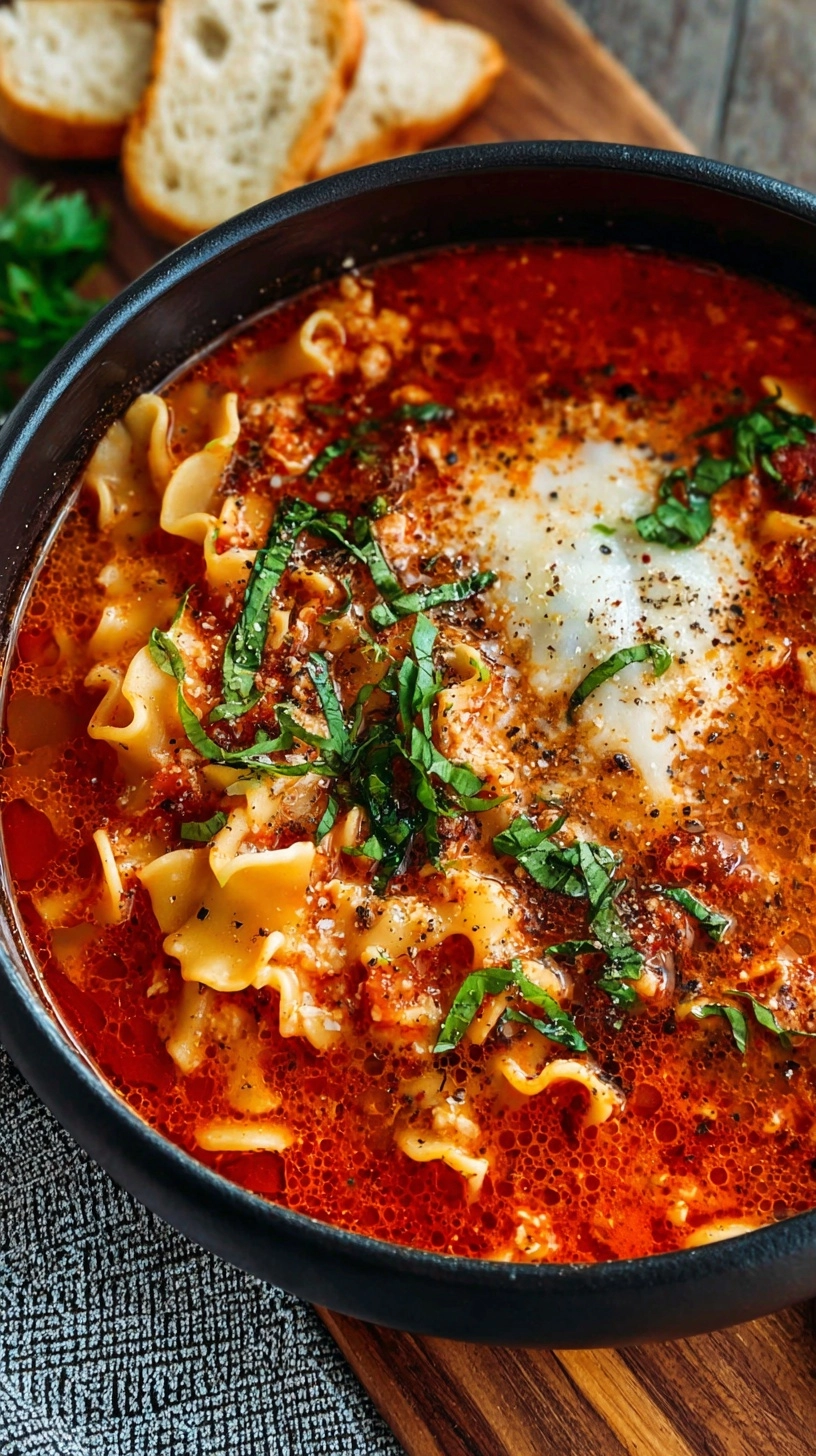 Serve this hearty easy lasagna soup in warmed bowls with a drizzle of high-quality olive oil and a sprinkle of fresh herbs. Pair with crusty artisan bread or homemade garlic breadsticks for dipping. For an elevated presentation, serve alongside a simple arugula salad dressed with lemon vinaigrette to cut through the richness. Consider offering additional grated Parmesan and red pepper flakes at the table, allowing each diner to customize their bowl to taste preferences.