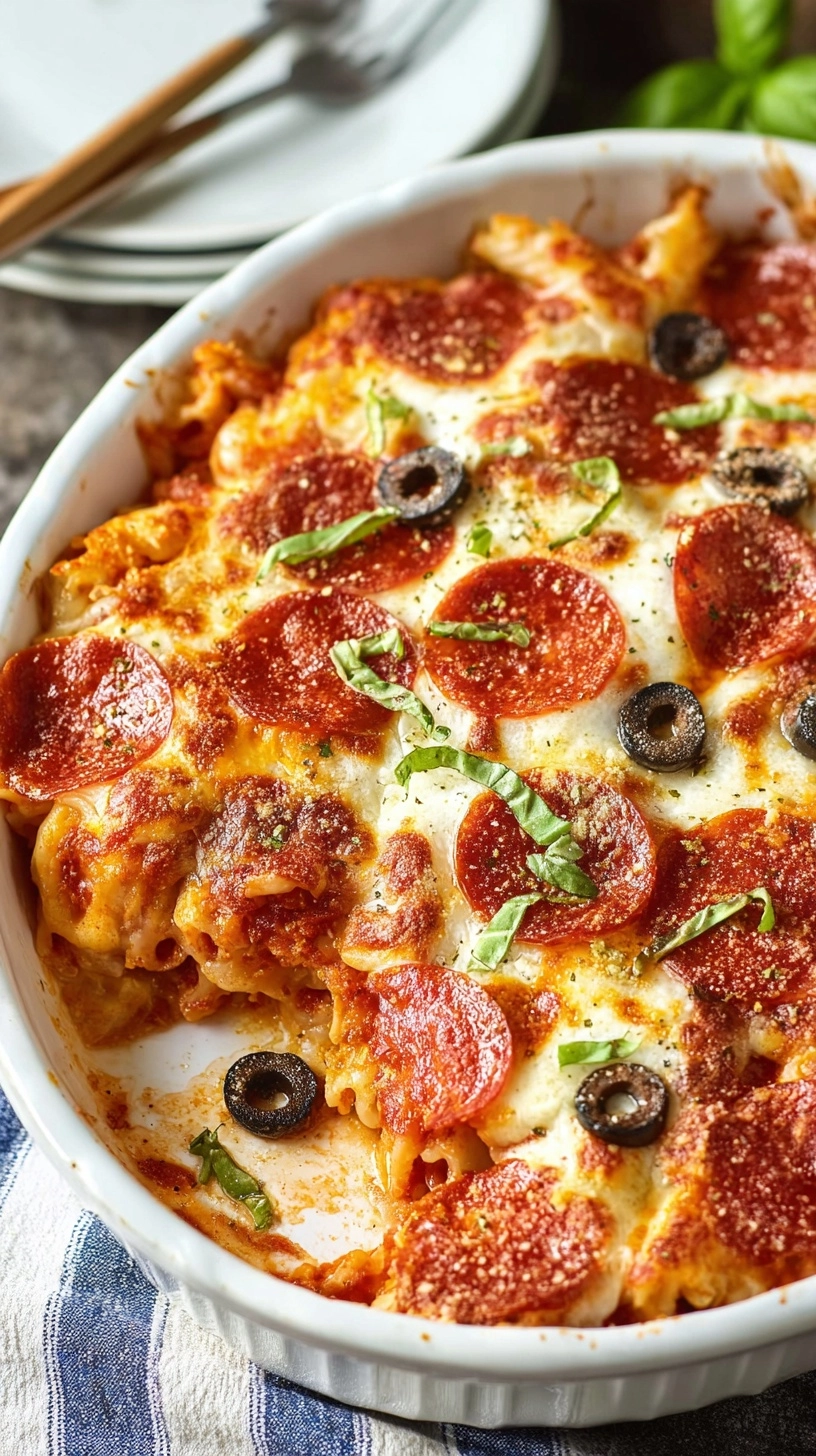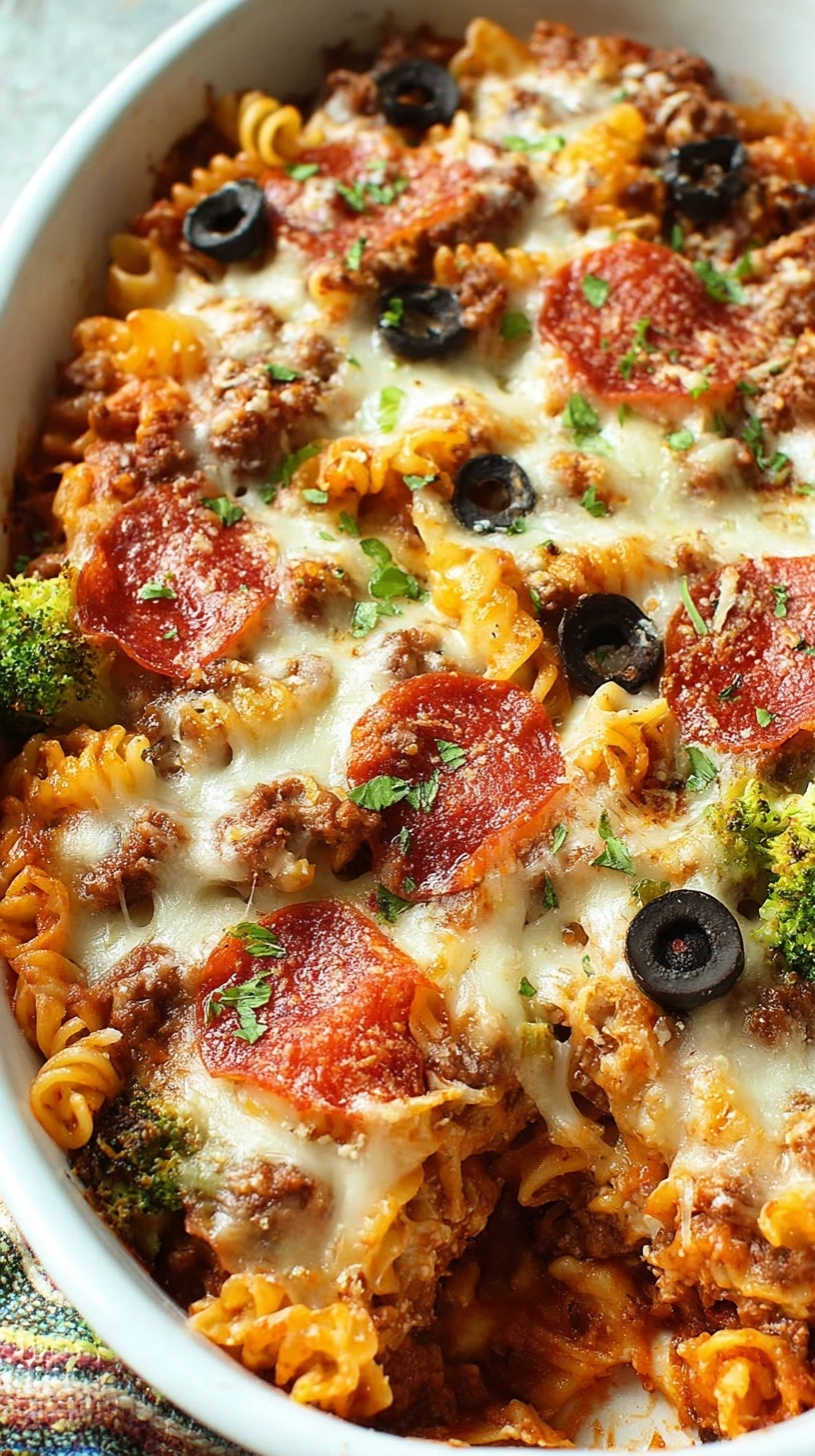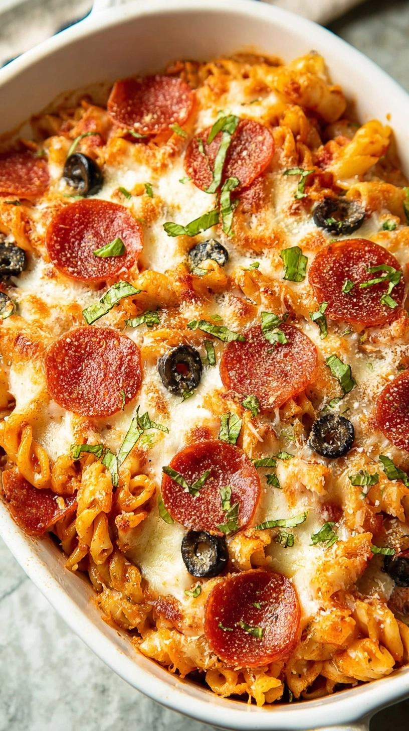 Preheat oven to 375°F. In a greased 9×13-inch baking dish, combine cooked pasta with the meat sauce mixture. Fold gently to distribute evenly. Top with half the mozzarella cheese, then arrange pepperoni slices and olives artfully across the surface. Finish with remaining mozzarella and all the Parmesan cheese.