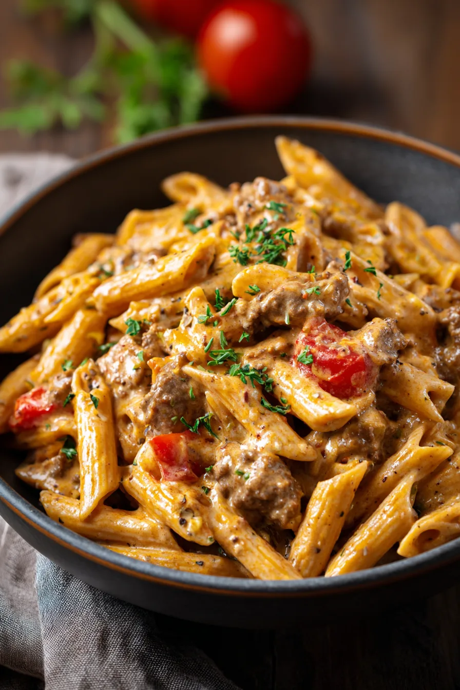 A: Penne, rigatoni, or shells work excellently because their hollows capture the creamy sauce. Avoid long pasta like spaghetti, which doesn’t hold the chunky beef mixture as effectively.