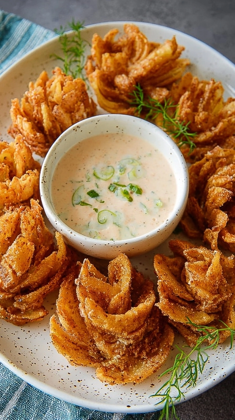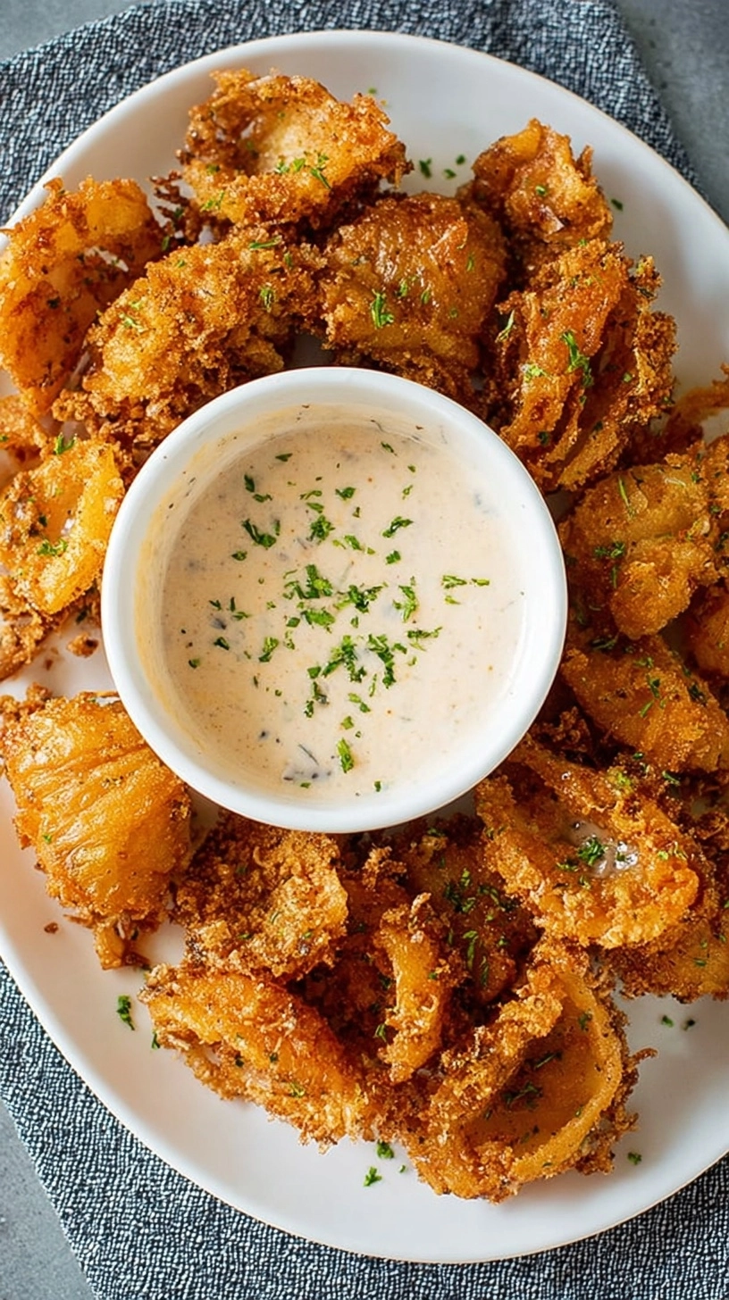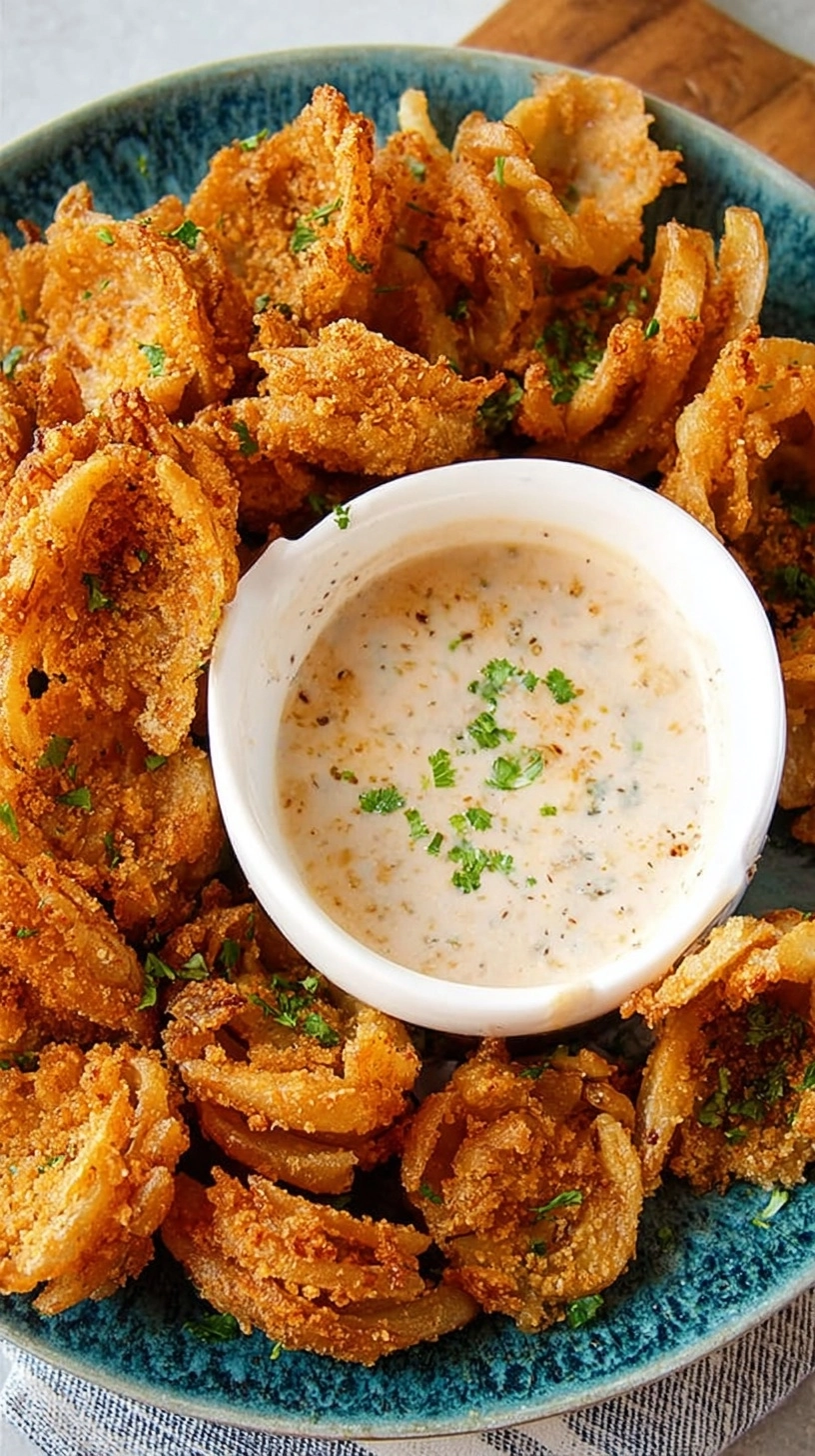 Present your bite-sized blooming onions on a rustic wooden board with individual ramekins of buttermilk ranch dip for elegant entertaining. Create a “build-your-own” appetizer station by offering multiple dipping sauces – try spicy chipotle mayo, honey mustard, or tangy barbecue sauce alongside the classic ranch. For game day gatherings, serve in paper cones for easy handheld eating. The bite-sized format makes these perfect for cocktail parties, where guests can enjoy restaurant-quality flavors without the mess of traditional blooming onions.