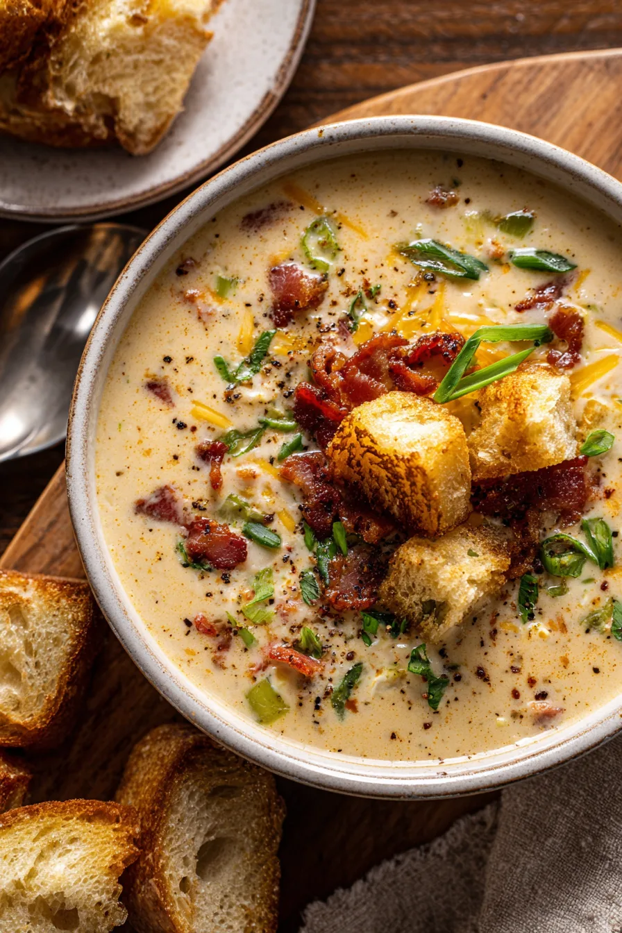 Remove from heat and gradually add shredded cheeses, stirring until completely melted. Season with smoked paprika, cumin, salt, and pepper. Return half the cooked bacon to the soup, reserving the rest for garnish.