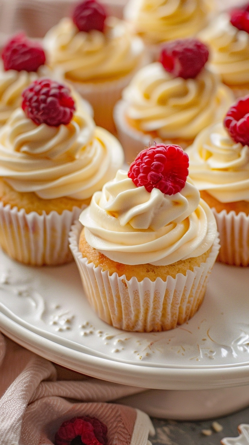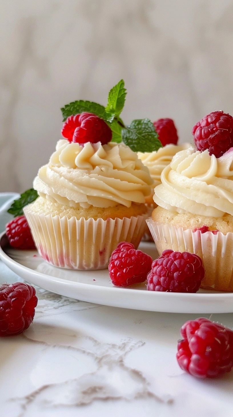 Using a piping bag fitted with a star tip, pipe frosting onto cooled cupcakes. Top each with fresh raspberries for that stunning bakery-style presentation.