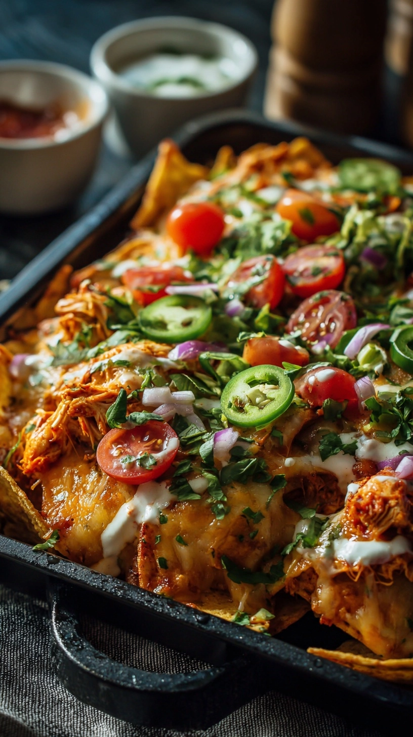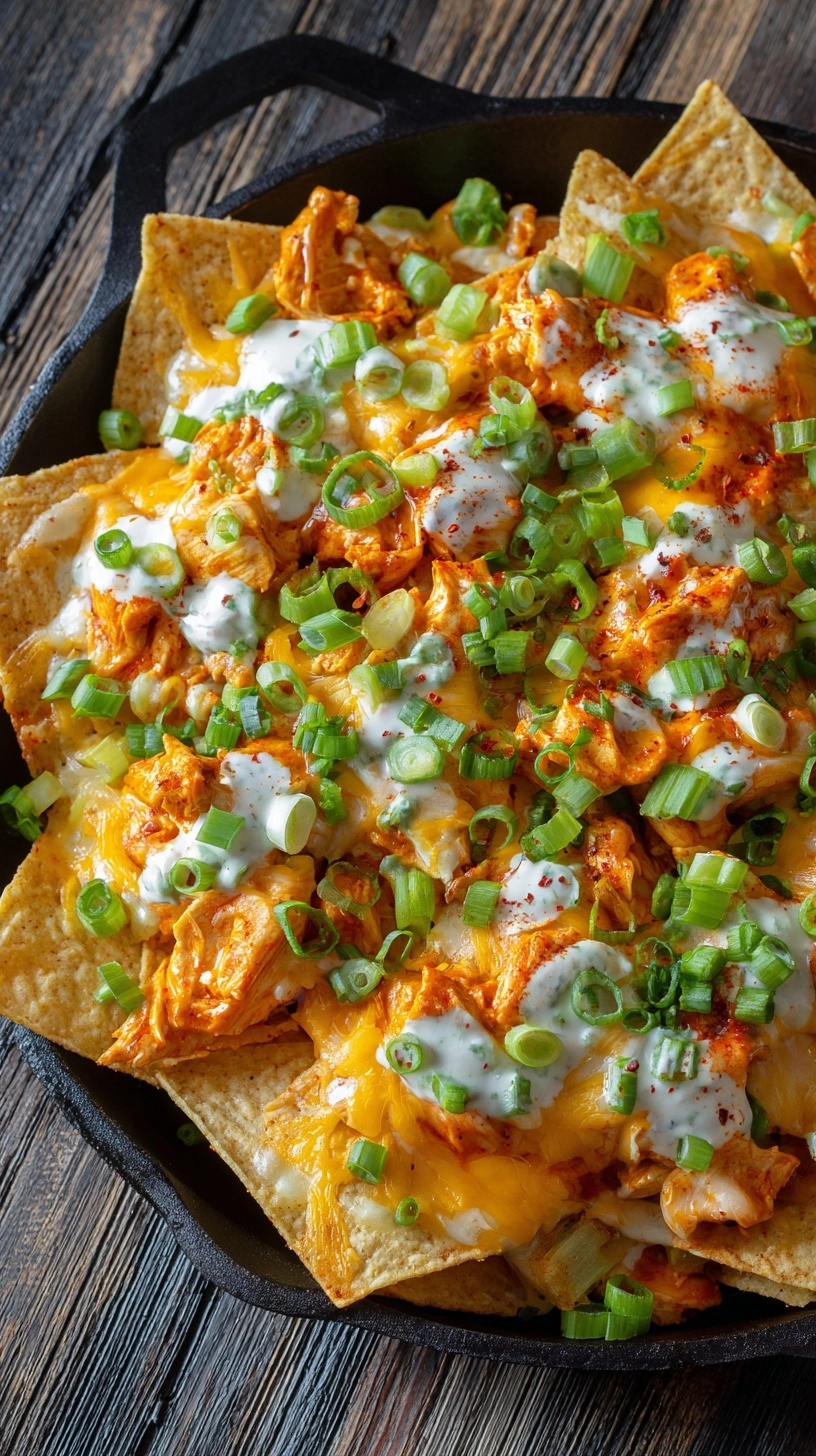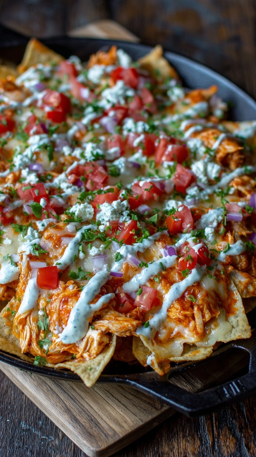 Present your loaded buffalo chicken nachos on a large wooden board or cast-iron skillet for authentic appeal. Arrange small bowls of extra ranch dressing, blue cheese dressing, and sliced jalapeños around the main dish for customizable heat levels.