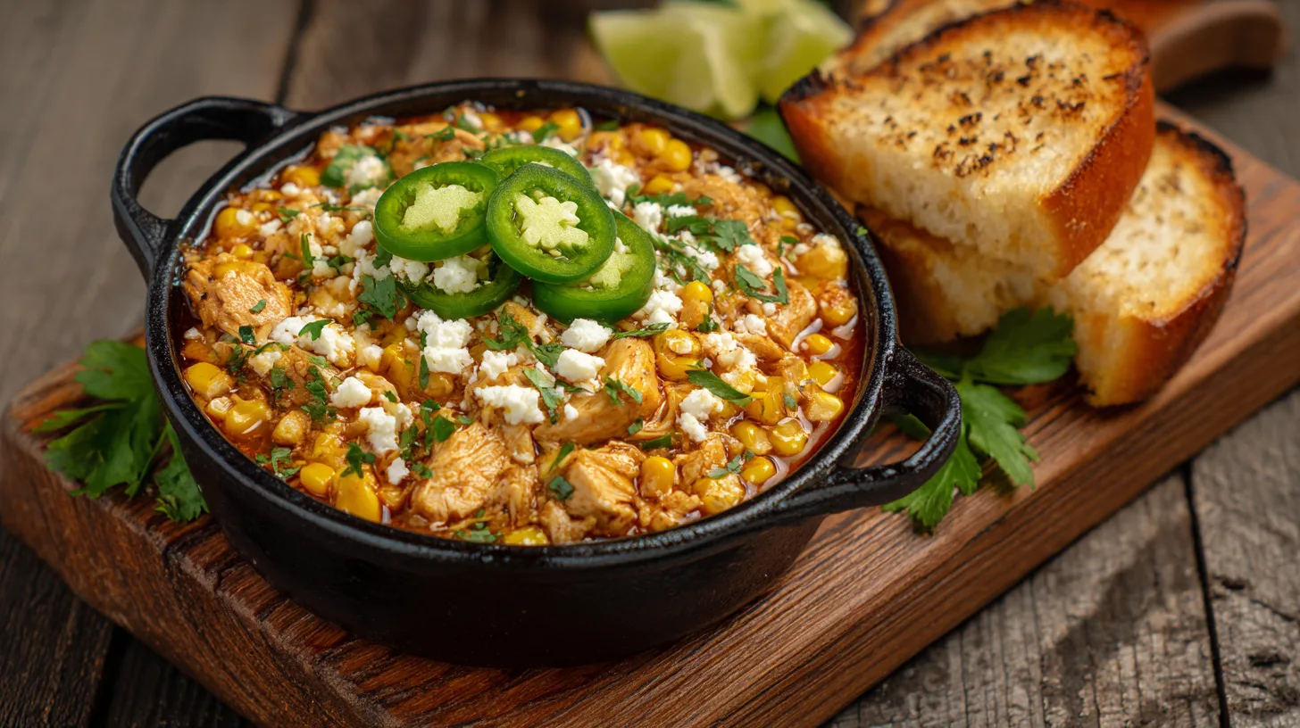 While chicken simmers, char corn kernels in a dry skillet over high heat for 5-7 minutes, stirring occasionally. You want some kernels deeply golden and slightly blackened – this mimics the authentic street corn experience and adds smoky complexity to your chili.