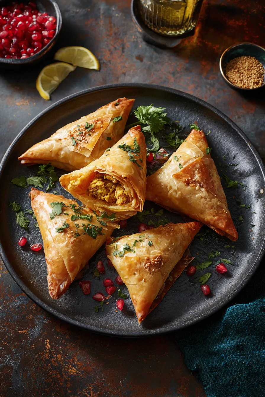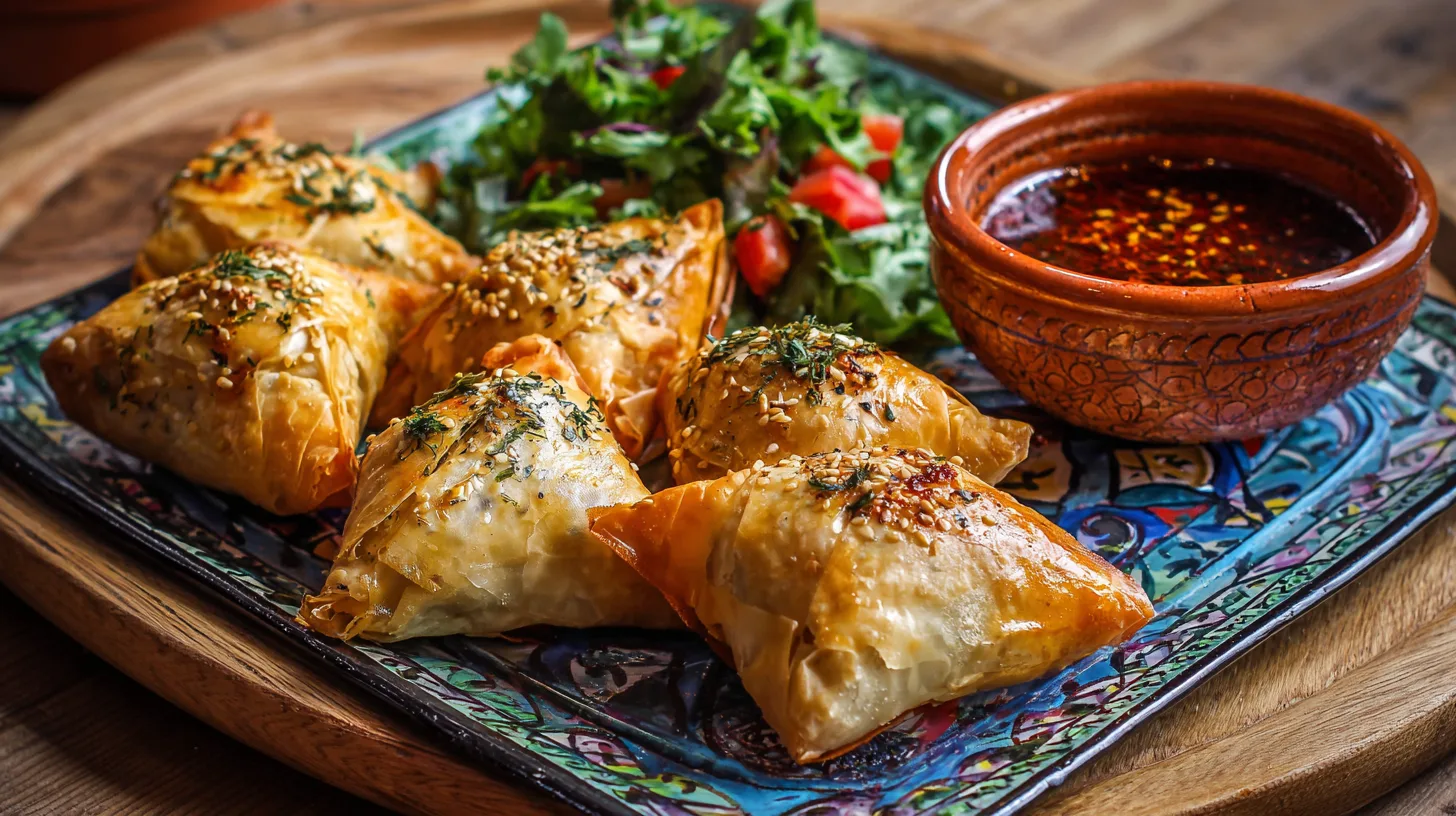 Serve these golden triangular delights alongside cooling mint yogurt sauce or harissa-spiced tomato chutney. For elegant presentation, arrange on wooden serving boards with dates, olives, and fresh herbs. These briouats pair beautifully with Moroccan mint tea or fresh lemonade for authentic cultural experience.