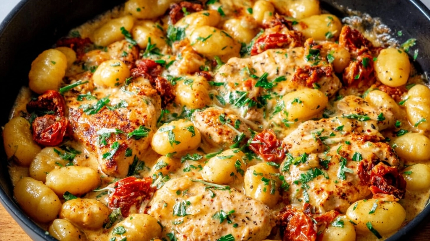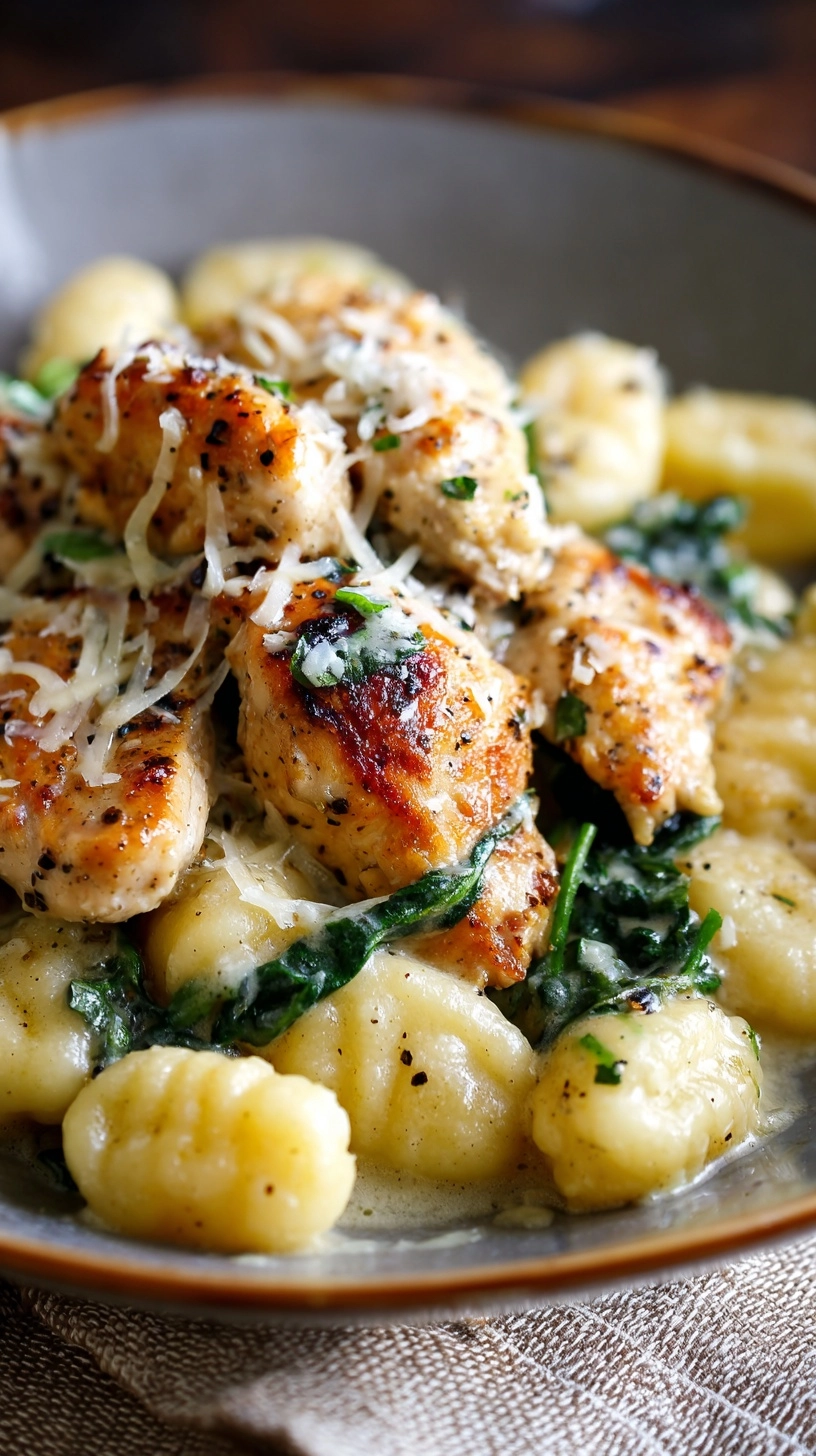 Return the seared chicken to the skillet along with any accumulated juices. Pour in heavy cream and bring the mixture to a gentle simmer. Cook for 5-7 minutes, stirring occasionally, until the sauce thickens slightly and gnocchi are tender.