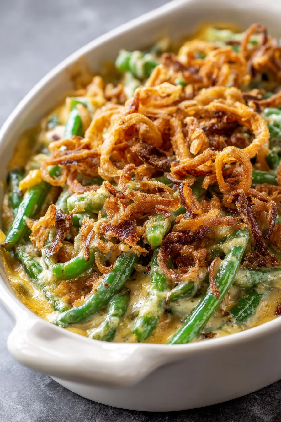 Store leftover Paula Deen Green Bean Casserole in the refrigerator for up to 4 days in an airtight container. For optimal reheating, use a 325°F oven for 15-20 minutes, covering with foil to prevent the topping from over-browning. The casserole can be assembled completely up to 24 hours ahead and refrigerated before the final baking step – simply add 10 extra minutes to the cooking time if baking from cold. For longer storage, freeze portions for up to 3 months, though the texture may be slightly softer upon reheating.