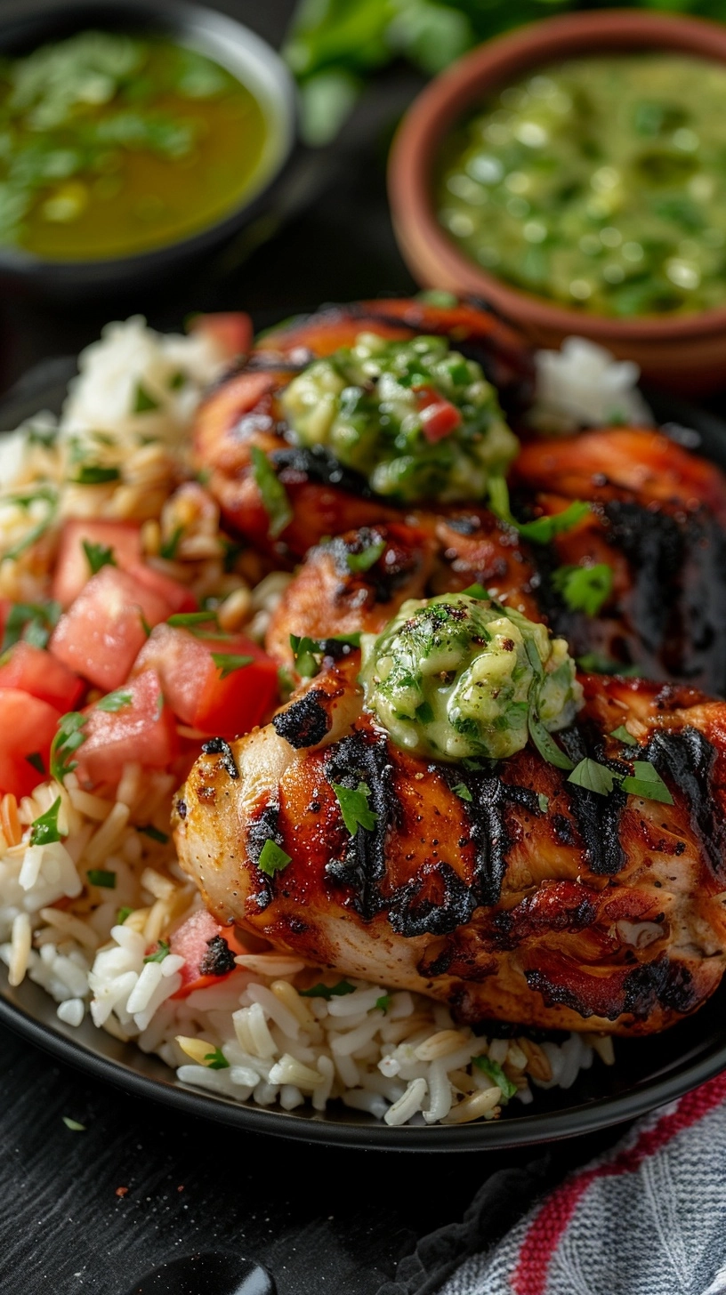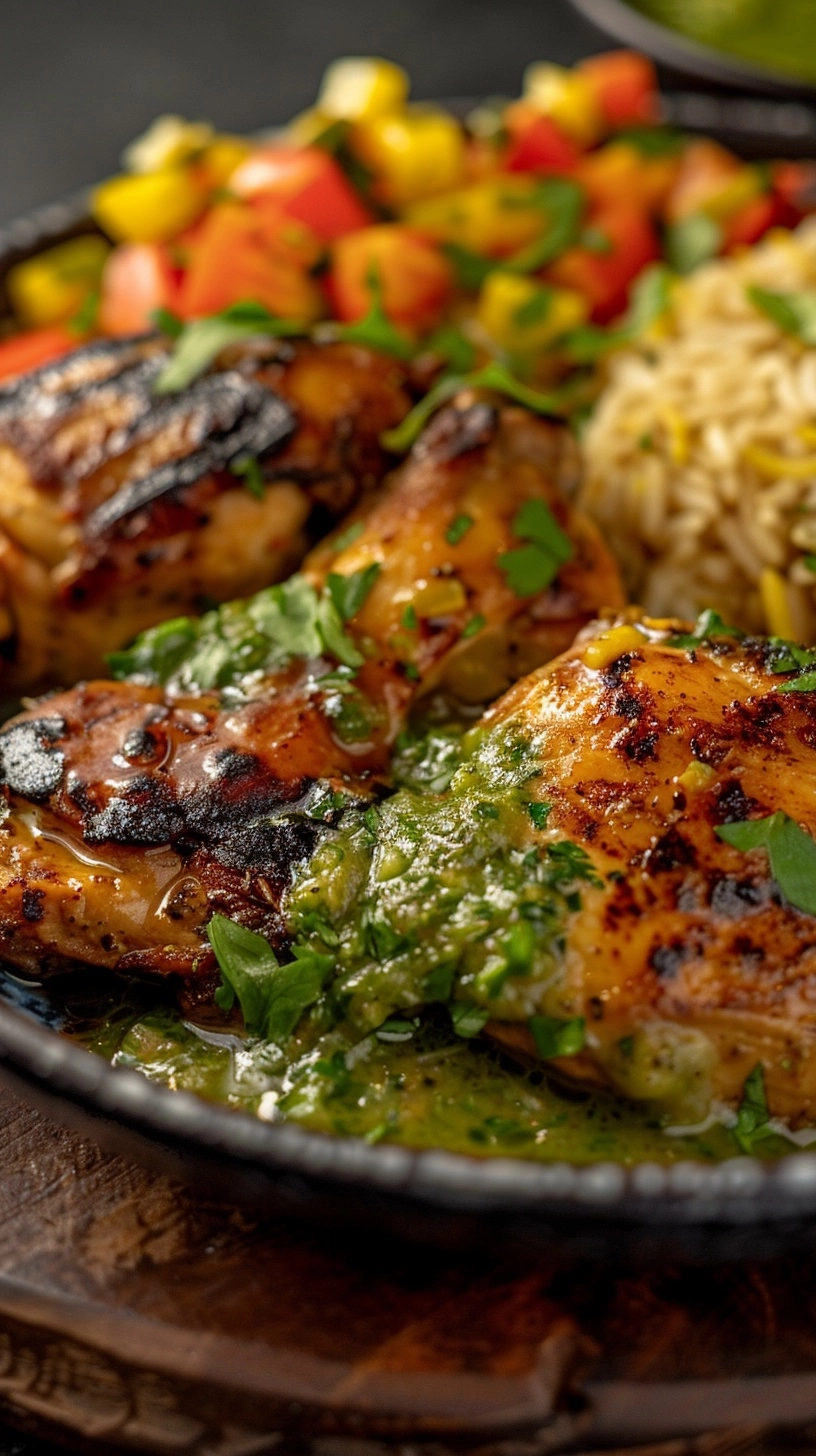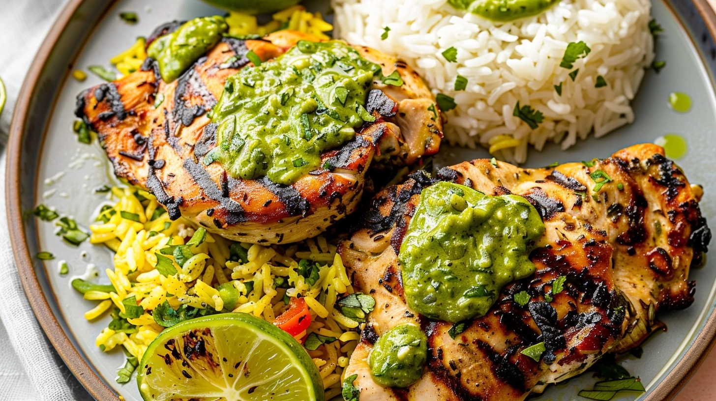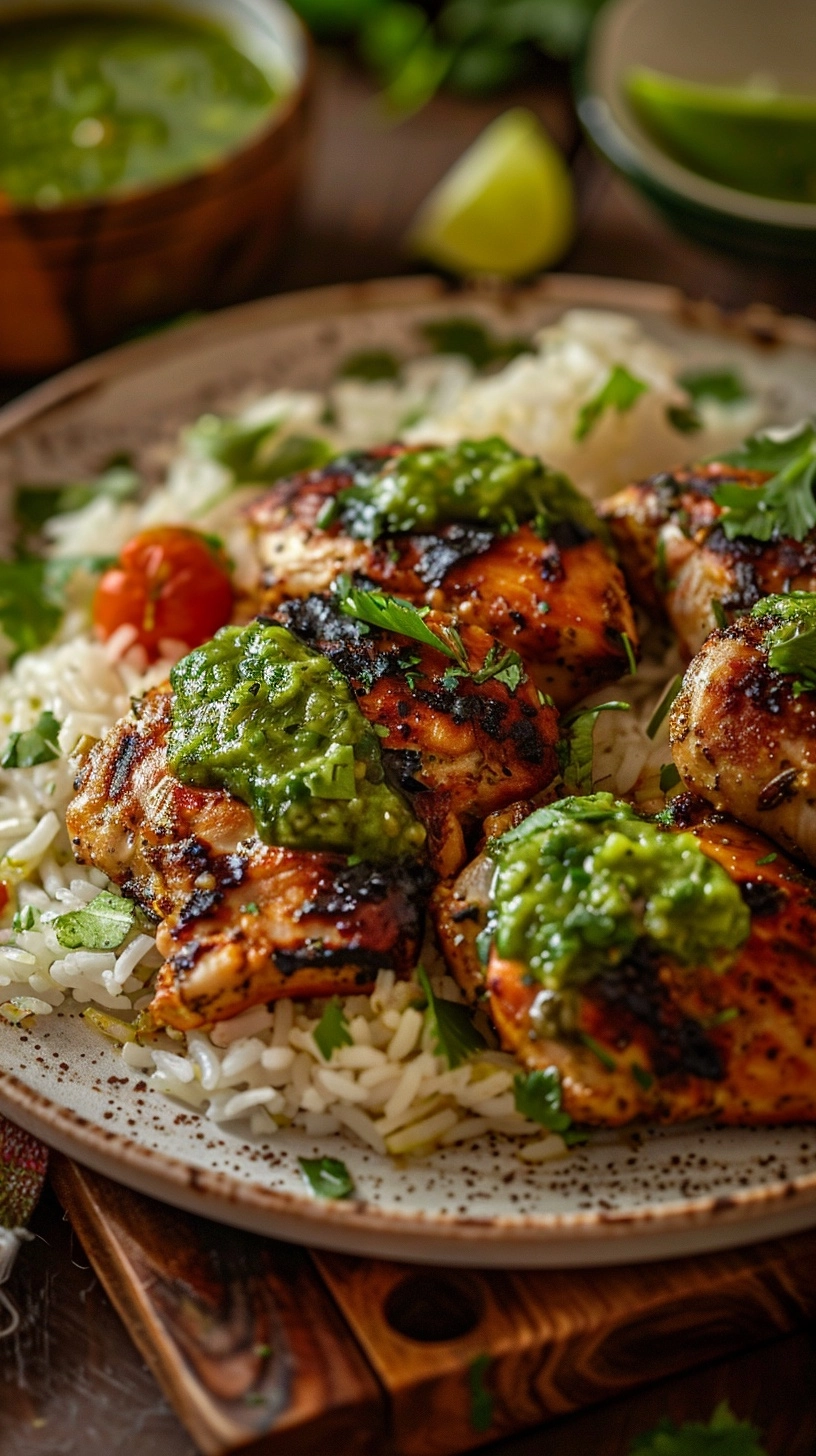 Let chicken rest 5 minutes after cooking – this redistributes juices for maximum tenderness. Fluff rice with a fork and arrange on serving platter alongside chicken. Drizzle green sauce generously or serve alongside for individual portioning.
