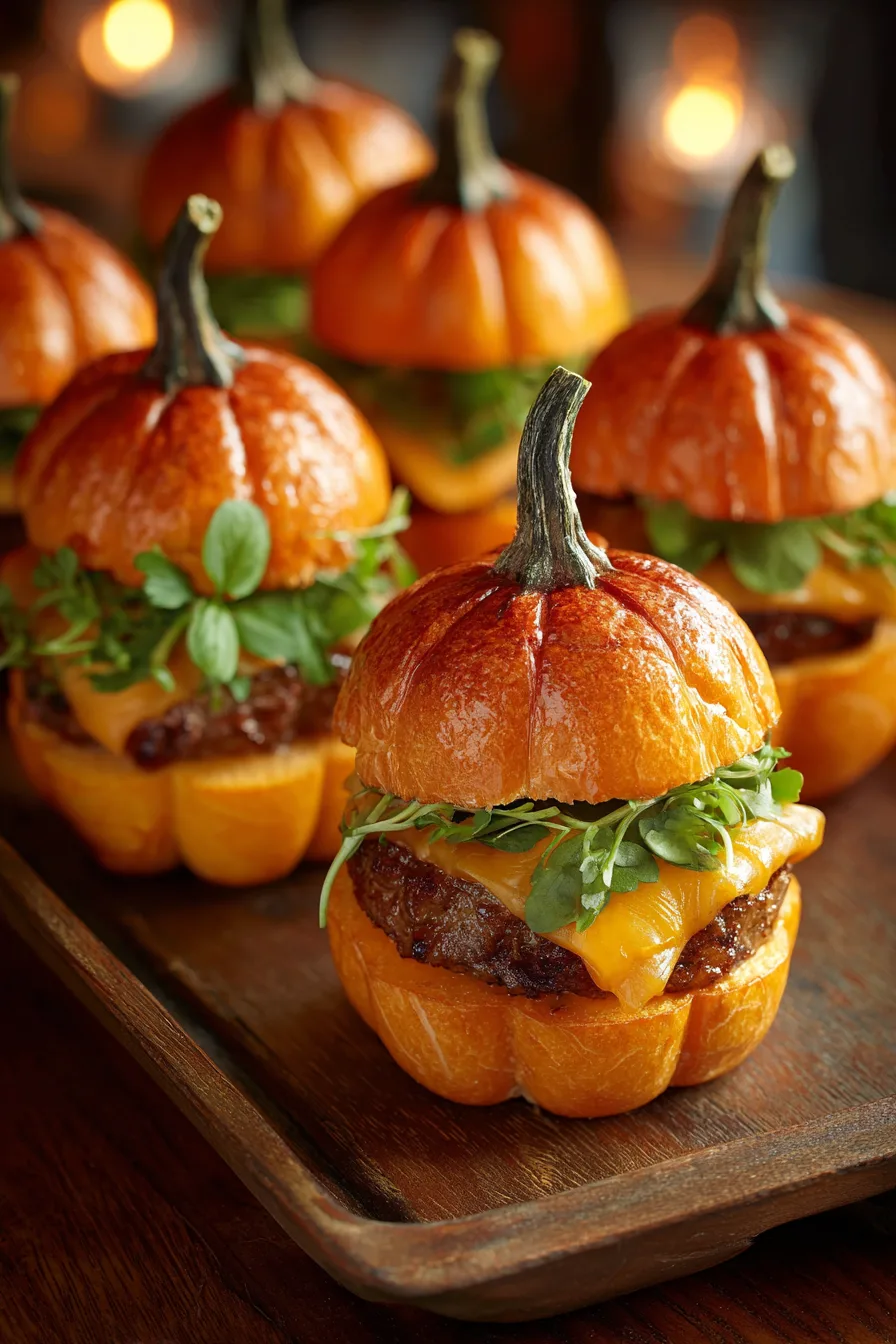 Present your pumpkin-shaped sliders on a rustic wooden board surrounded by autumn leaves for maximum visual impact. Pair with sweet potato fries, roasted butternut squash soup shooters, or a harvest salad featuring mixed greens, dried cranberries, and pumpkin seeds.
