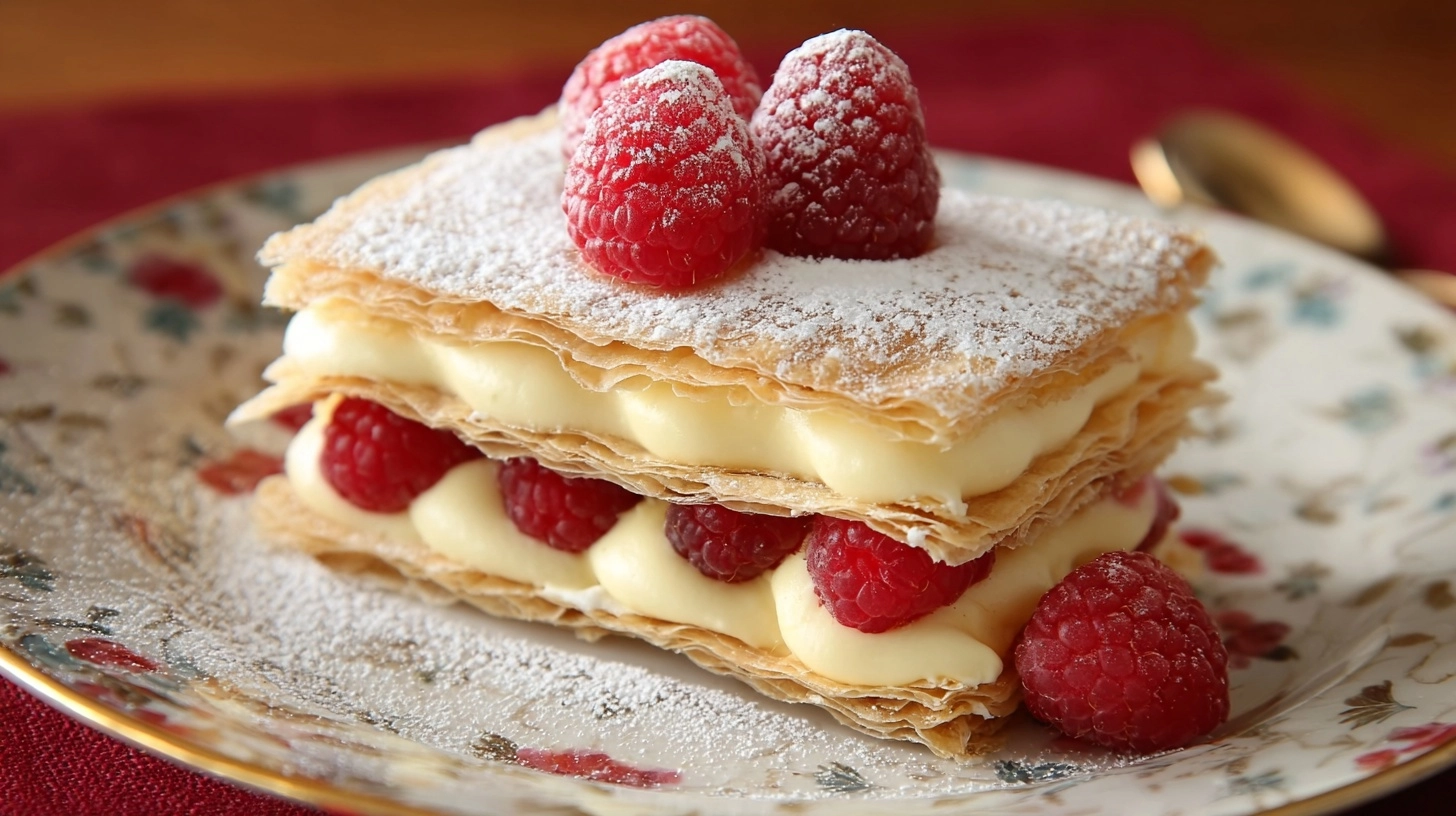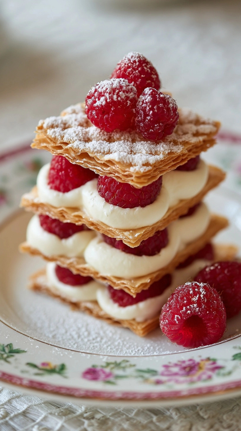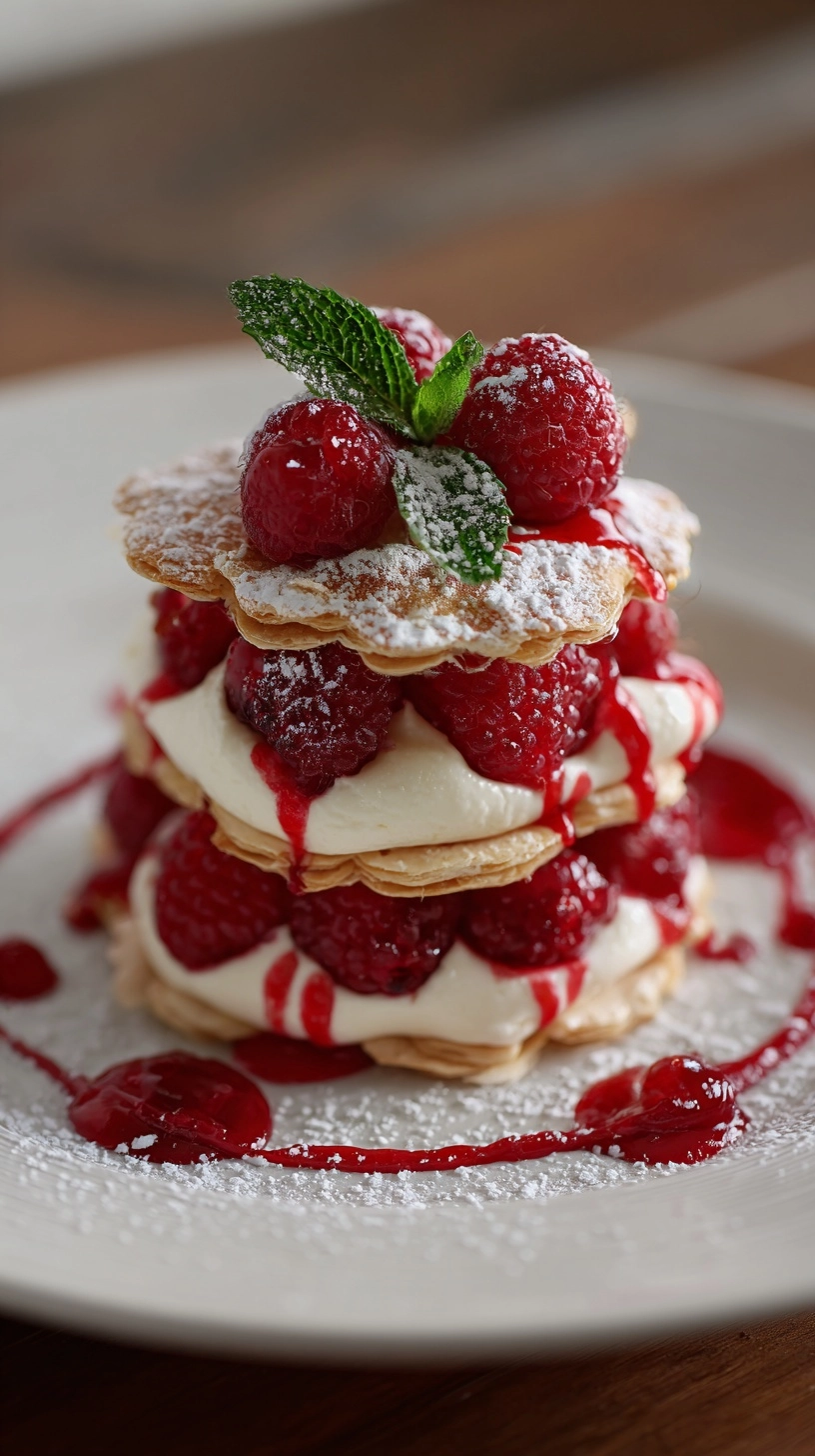 Elegant Plating: Dust plates with powdered sugar, drizzle raspberry coulis in artistic patterns, and position Napoleons at slight angles for dynamic visual interest. Garnish with mint sprigs and extra fresh raspberries.