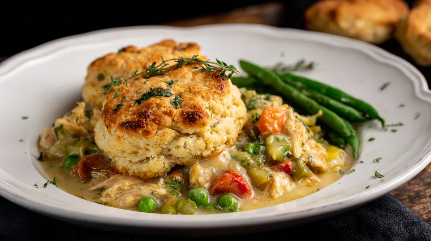 Store leftover red lobster biscuit chicken pot pie in the refrigerator for up to 4 days in an airtight container. To maintain biscuit texture, reheat individual portions in a 350°F oven for 8-10 minutes rather than using the microwave. The dish freezes exceptionally well for up to 3 months – assemble completely but freeze before baking, then bake directly from frozen, adding an extra 15-20 minutes to cooking time. For meal prep, prepare the filling up to 2 days ahead and add fresh biscuit topping when ready to bake.