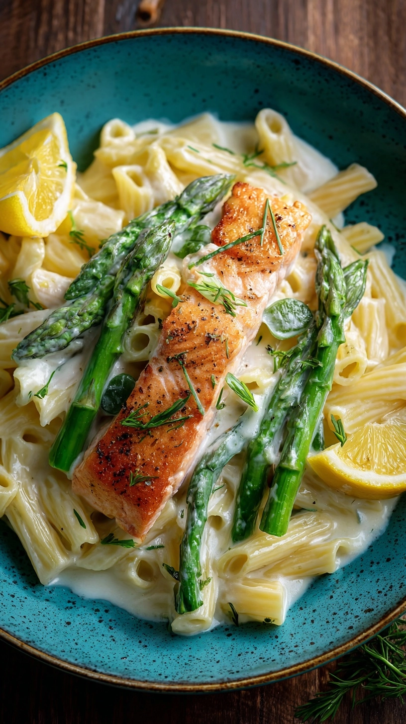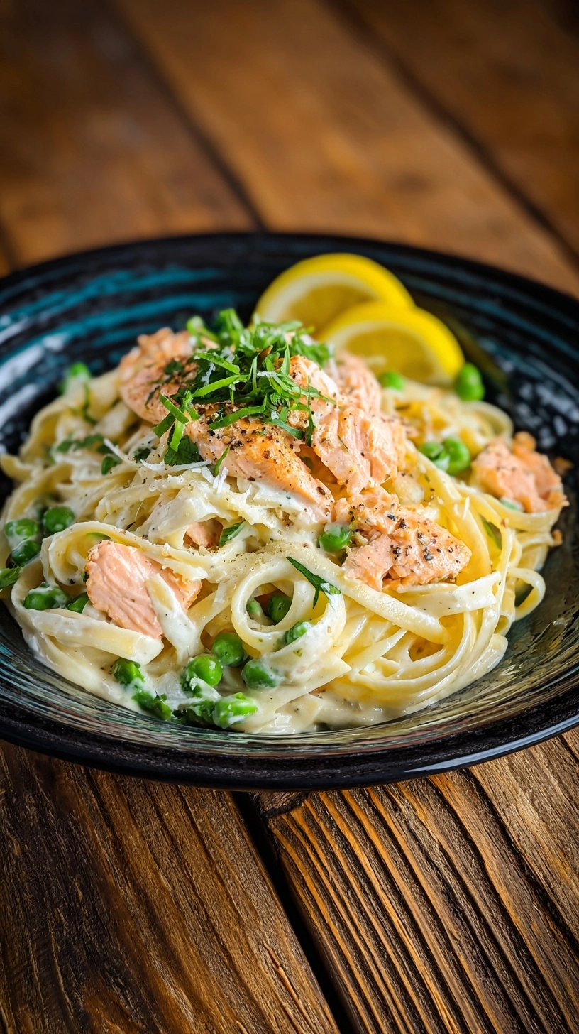 Present your salmon pasta with lemon cream sauce in warmed pasta bowls to maintain optimal temperature throughout the meal. Pair with a crisp arugula salad dressed with light vinaigrette to balance the dish’s richness, or serve alongside roasted asparagus and cherry tomatoes for added color and nutrients. Consider offering warm, crusty sourdough bread for sauce-sopping pleasure. For special occasions, garnish each serving with a sprinkle of fresh herbs, a lemon wheel, and a light dusting of additional Parmesan cheese for restaurant-style presentation that impresses guests and family alike.