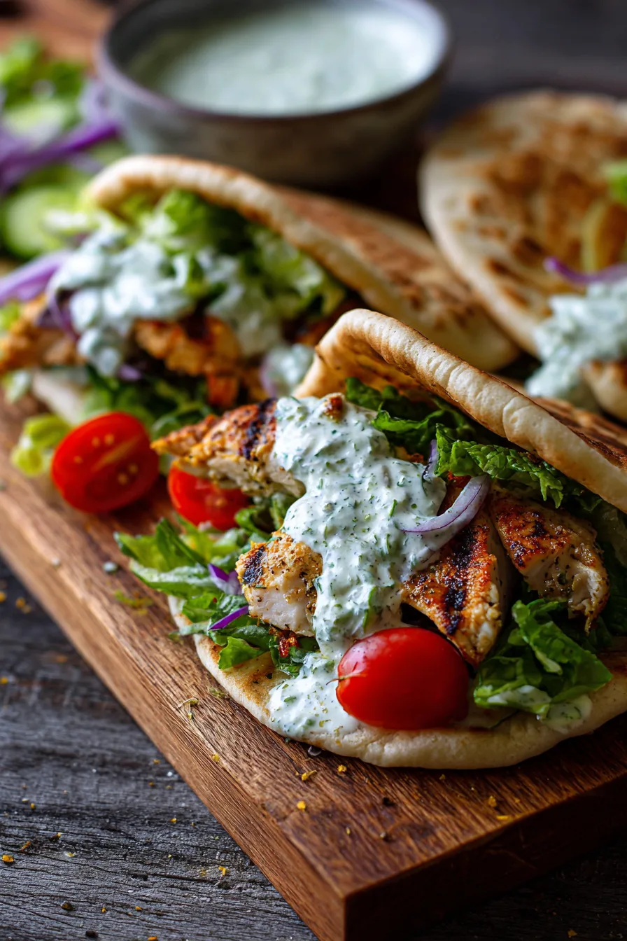 While the chicken rests for 5 minutes, warm your pita breads in the oven for 2-3 minutes or wrap in damp paper towels and microwave for 30 seconds. Slice each pita in half to create pockets, then fill with the roasted chicken and vegetables, fresh lettuce, diced tomatoes, cucumber, and a generous dollop of herby ranch.