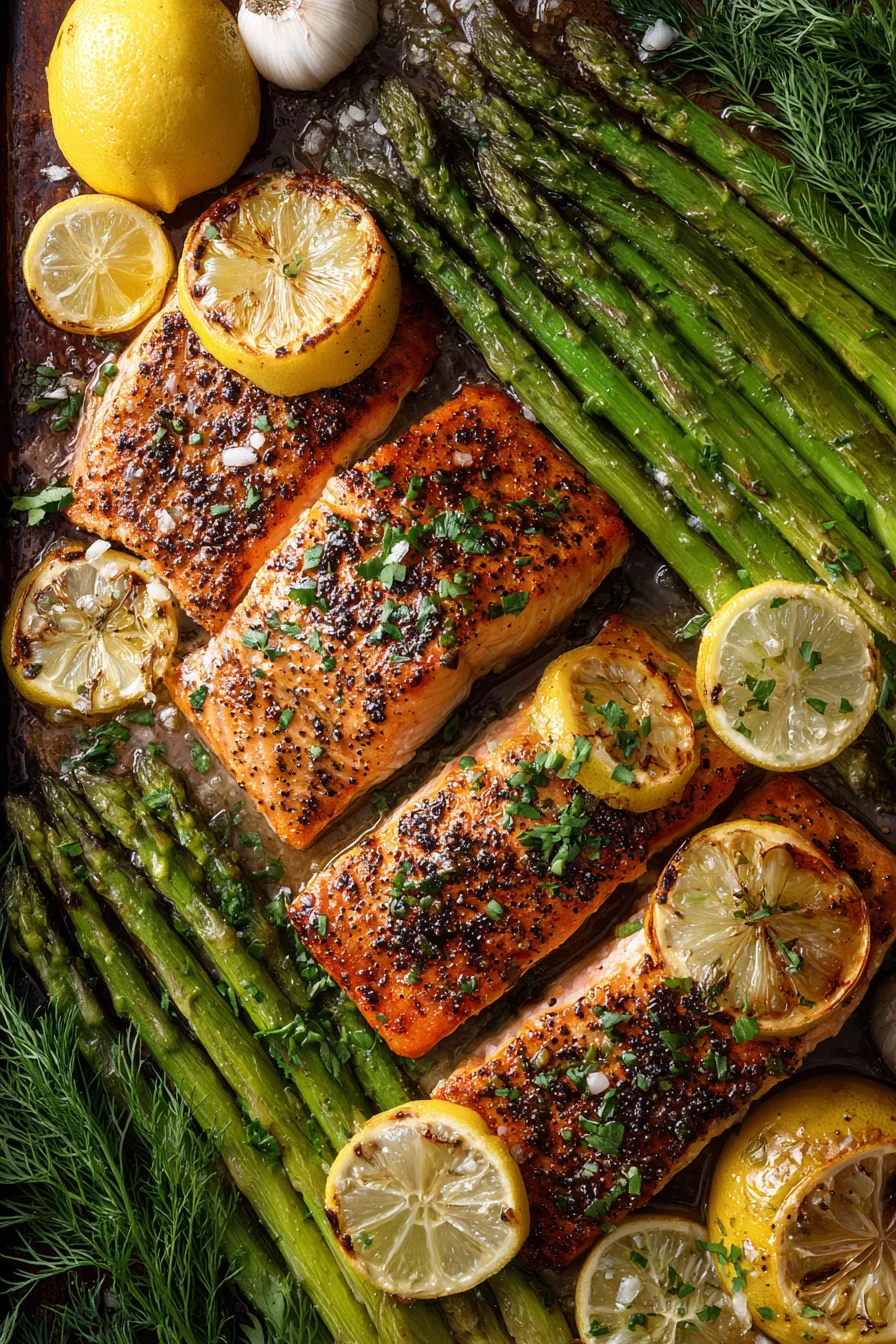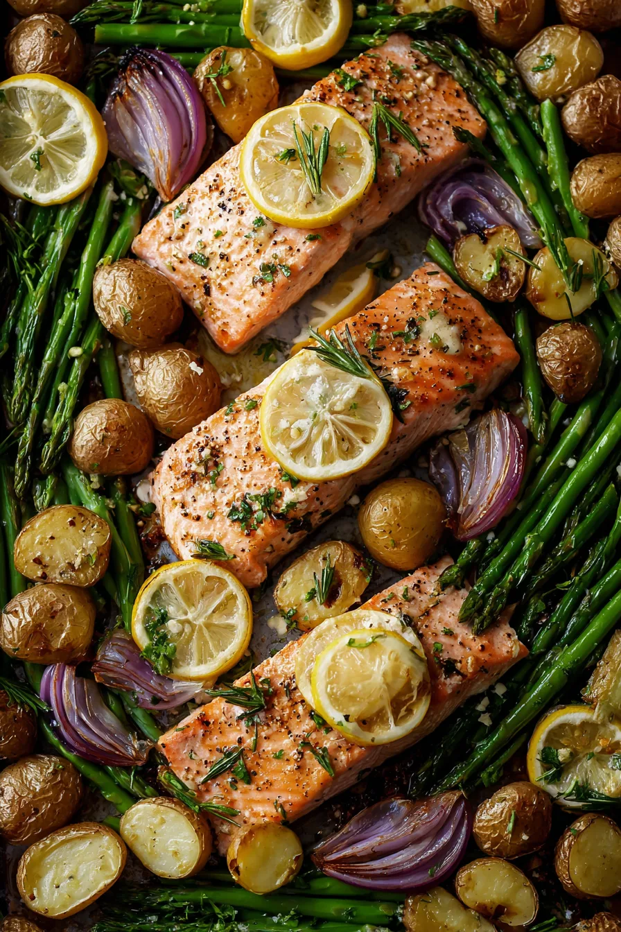 Arrange asparagus spears and red onion slices around the salmon. Drizzle remaining garlic butter over the vegetables. Nestle lemon slices between the salmon fillets – they’ll caramelize beautifully and provide bursts of citrus flavor.