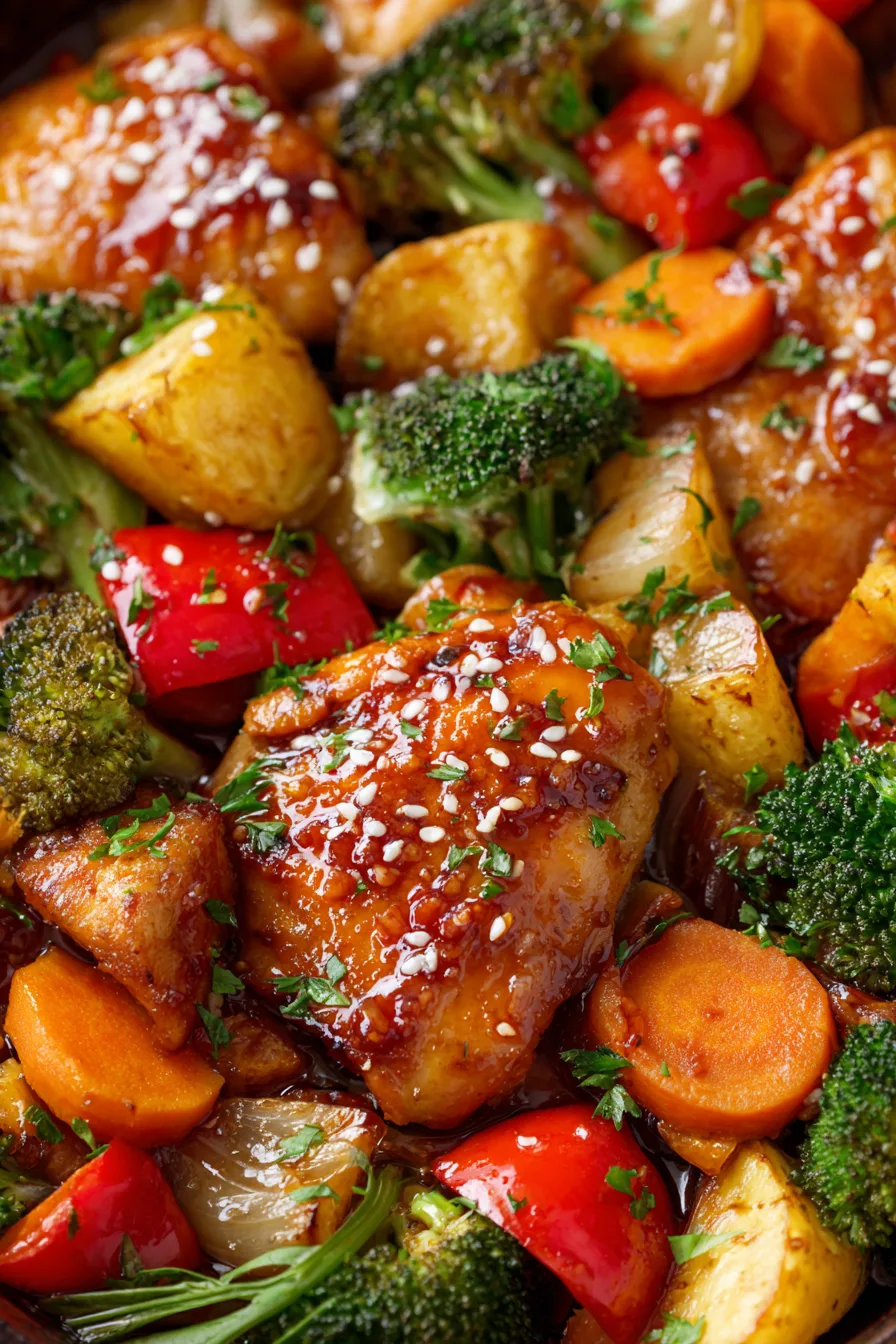 Pat chicken thighs dry with paper towels and season with salt and pepper. Nestle the seasoned chicken pieces over the vegetables, creating an even layer. Pour half of your prepared honey garlic sauce over the chicken, reserving the remainder for later use.