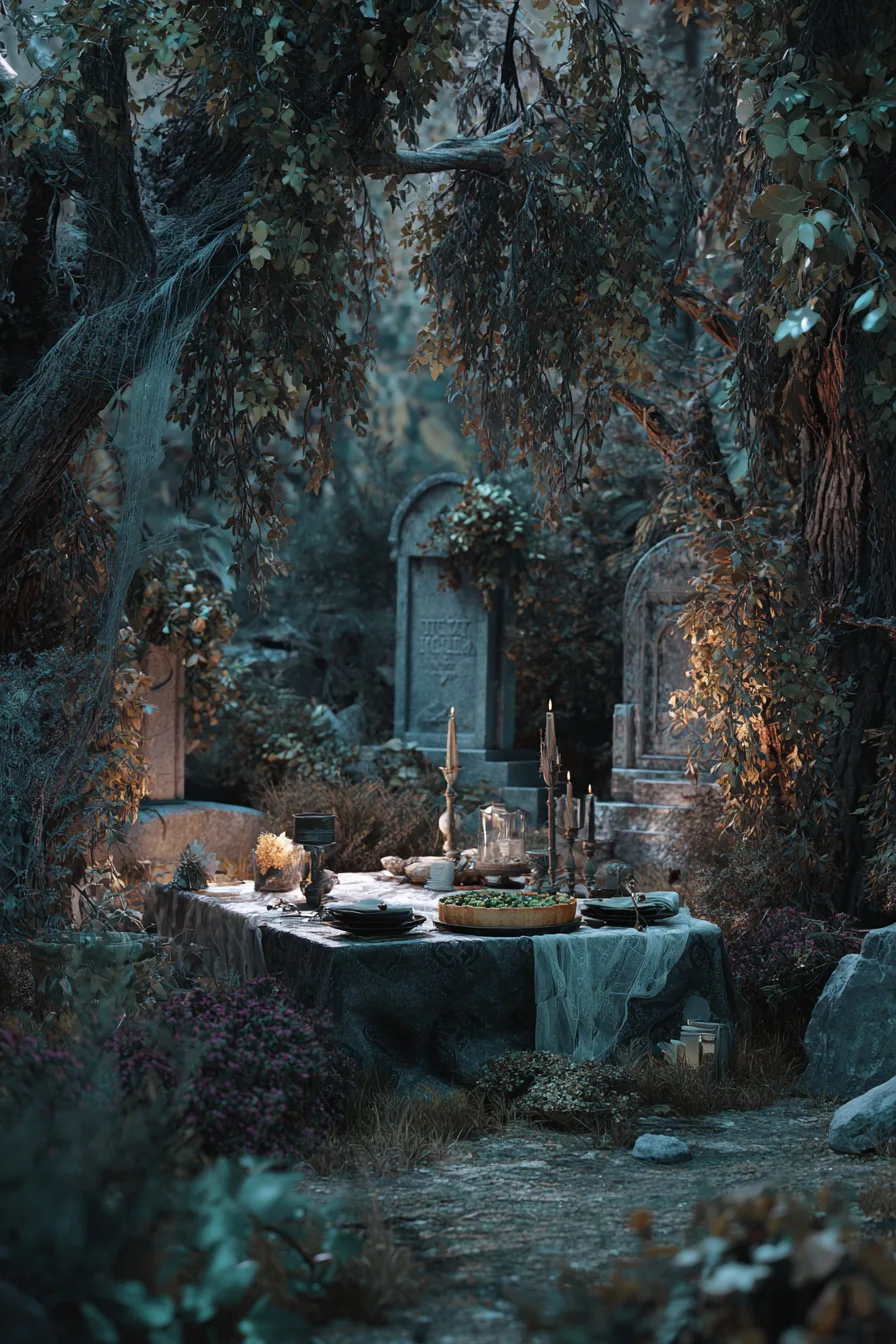 Present your graveyard masterpiece on a large black platter surrounded by an assortment of dippers including toasted baguette slices, colorful bell pepper strips, celery sticks, and pita chips. Create height variation by using small pedestals or cake stands to elevate different serving elements. Arrange orange and purple vegetables like carrots and purple cabbage around the base for additional Halloween ambiance. Consider providing small spoons for easy serving and individual paper plates decorated with Halloween themes.