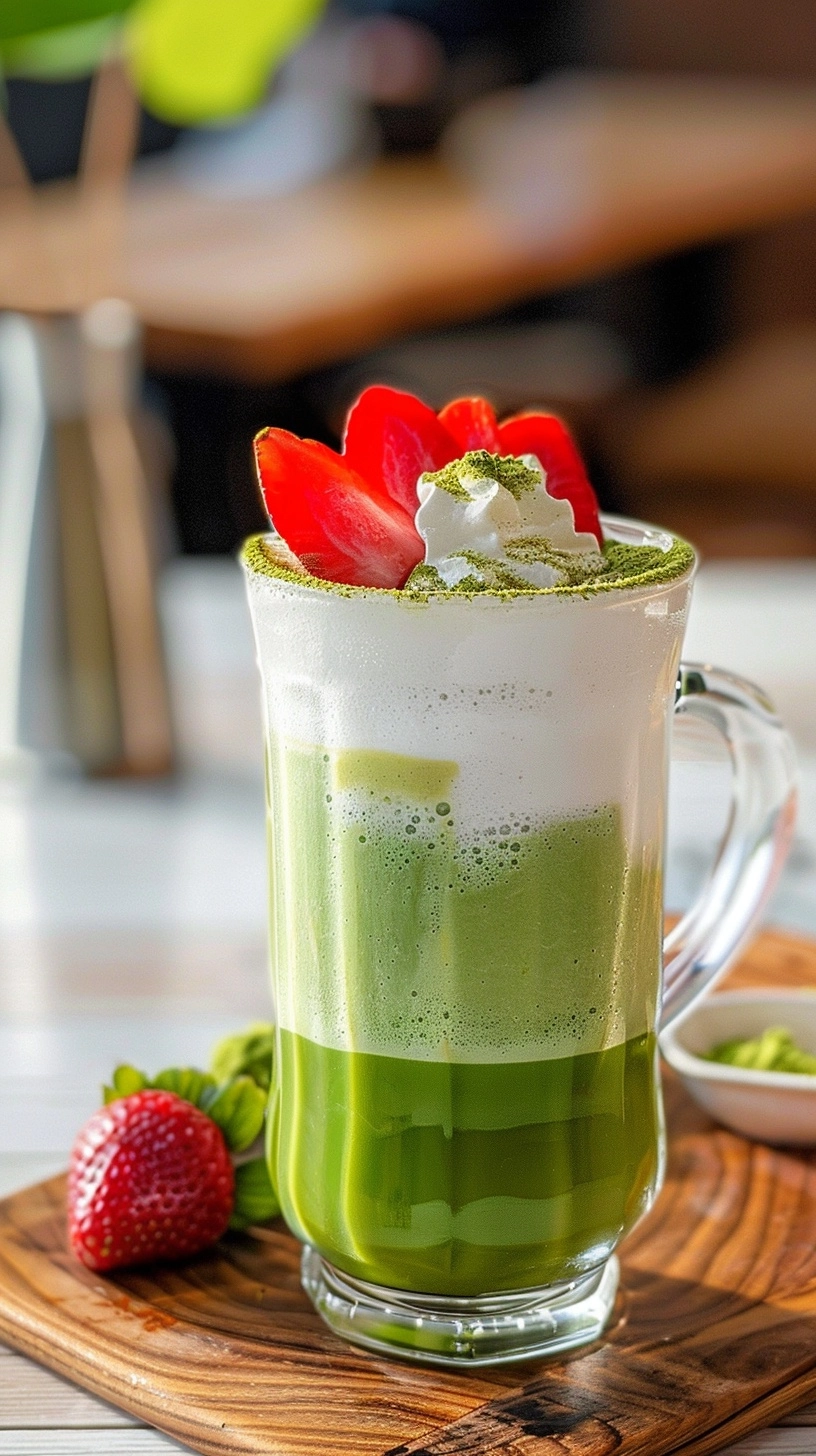 Add 2-3 tablespoons of strawberry puree to the bottom of a tall glass. Fill with ice cubes, then slowly pour the prepared matcha mixture over the back of a spoon to create distinct layers. Top with the frothed milk, allowing it to cascade through the layers naturally. Garnish with fresh strawberry slices and a light dusting of matcha powder for visual appeal.