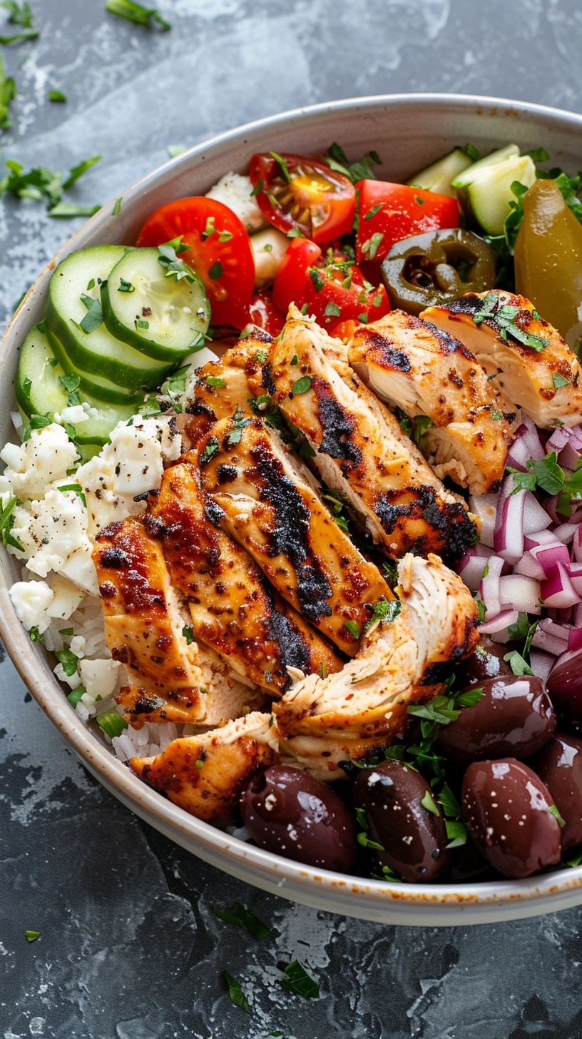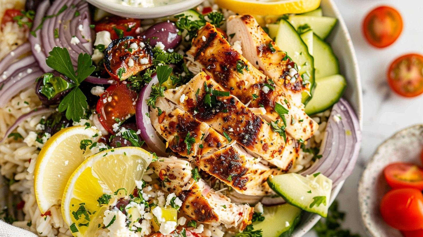 Start with a base of warm quinoa in each bowl—the nutty flavor complements the Mediterranean herbs beautifully. Arrange sliced chicken alongside fresh vegetables in colorful sections for visual appeal. Top generously with tzatziki sauce, crumbled feta, Kalamata olives, fresh parsley, and pine nuts for added richness.