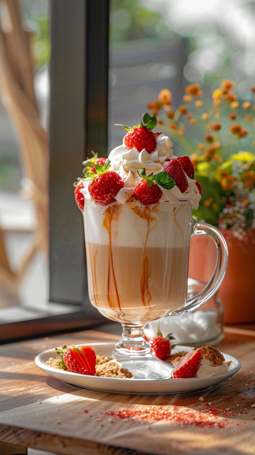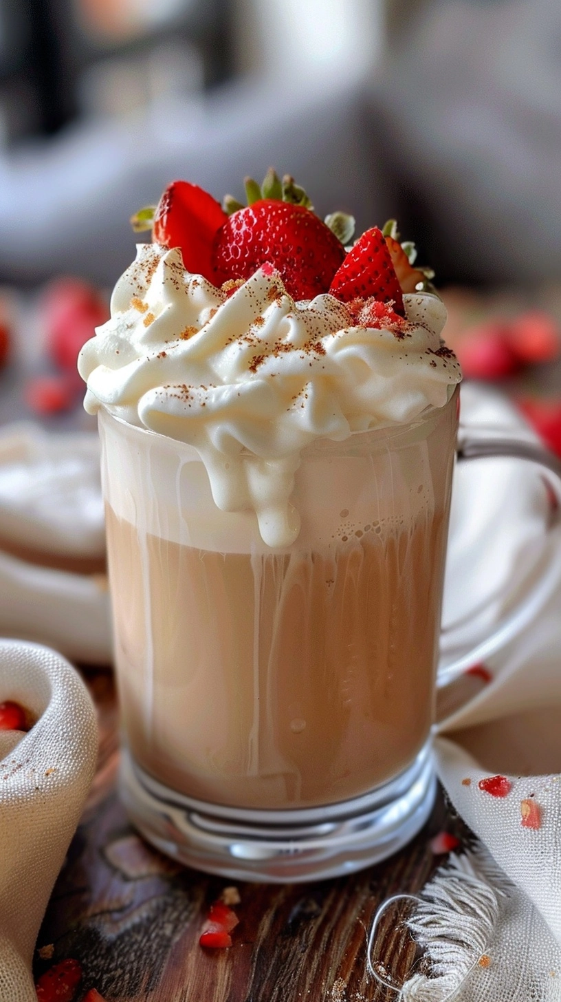 Top with a dollop of whipped cream, sprinkle crushed graham crackers for that authentic shortcake texture, and garnish with a fresh strawberry slice. A light dusting of cinnamon adds warmth and completes the dessert-inspired flavor profile.